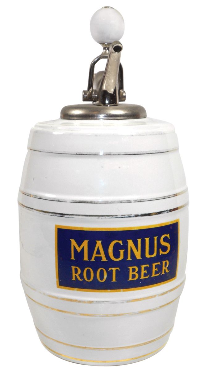 Syrup dispenser, Magnus Root Beer, ceramic barrel-shape w/ball-style replacement pump, some wear on gold bands & 1/2" no-harm old hairline on flange under pump, o/wise Exc cond, 16"H.