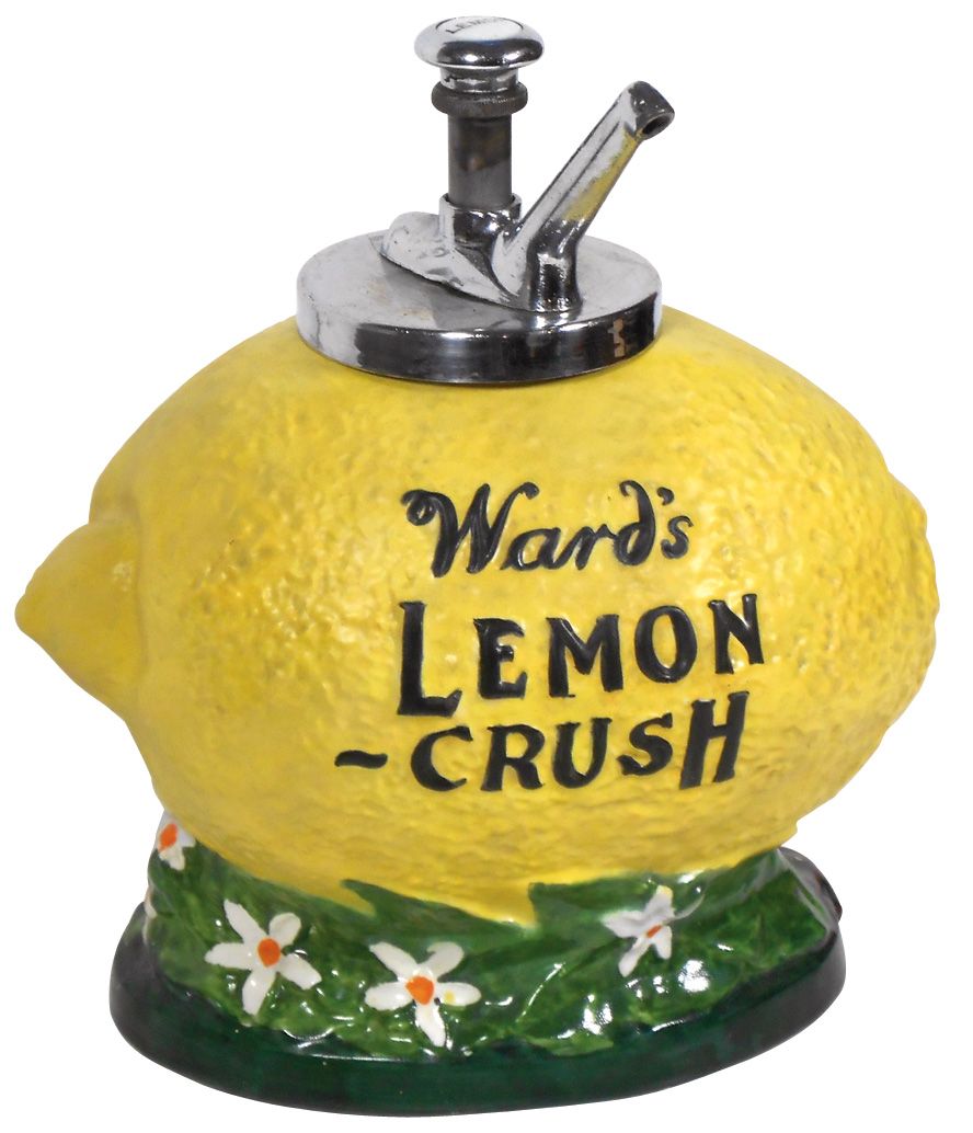Syrup dispenser, Ward's Lemon-Crush, lemon-shape, advertising on front & back, c.1910, plunger-style pump w/Lemon button insert dated 1925, Exc cond w/minor roughness on unglazed bottom, 11.5"H.