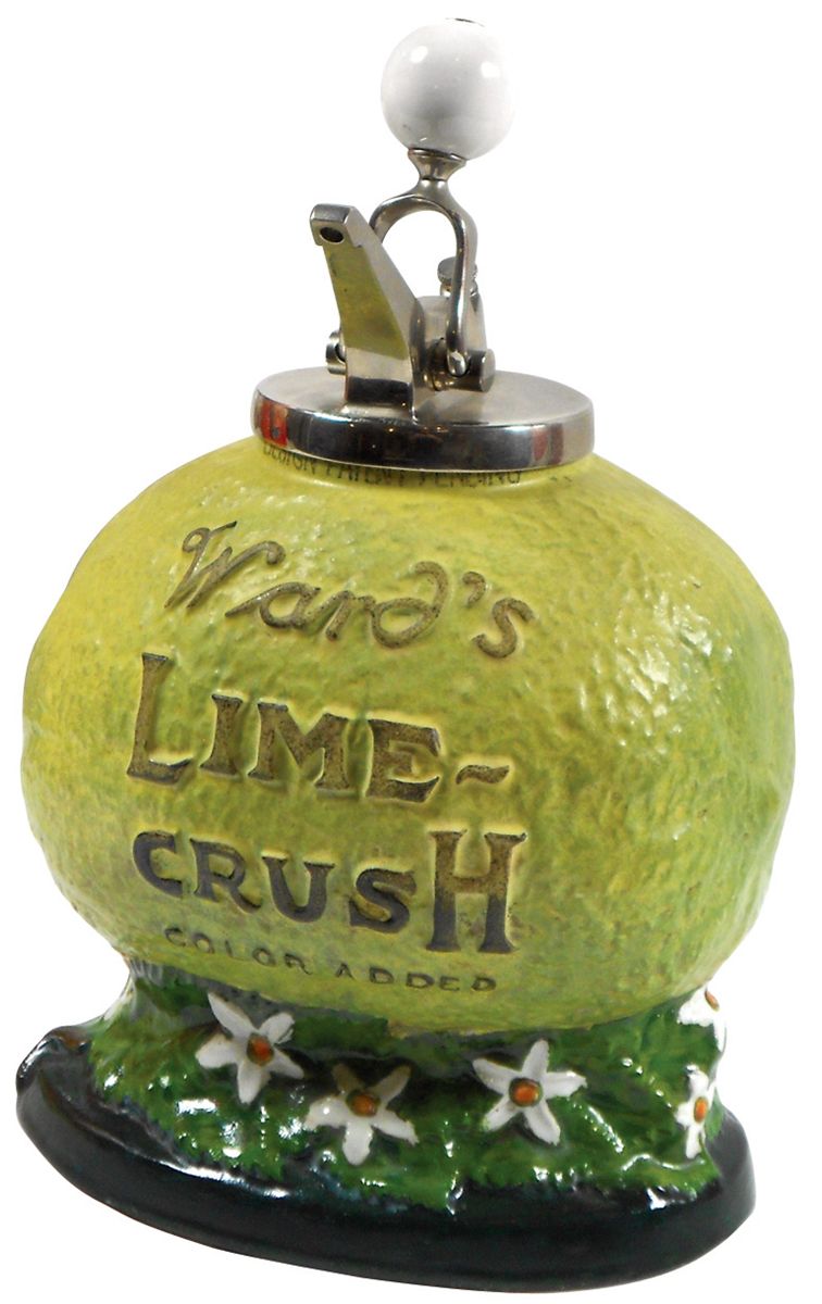 Syrup dispenser, Ward's Lime-Crush, "Color-Added" version, ceramic lime-shape w/correct contemporary ball-style pump, some faded lettering on front & back, o/wise Exc cond, 14"H x 10"W.