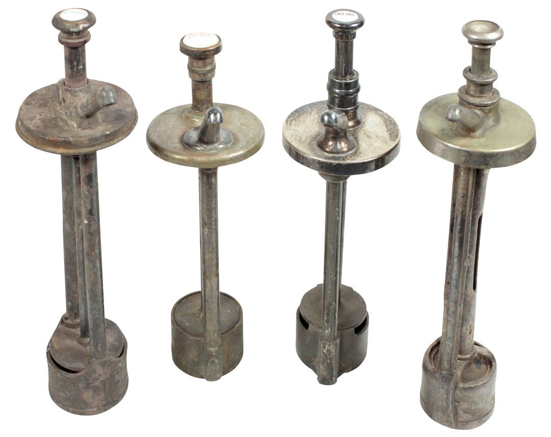 Syrup dispenser pumps (4), early round-top pumps w/Green River, Coca-Cola & Dr. Pepper button insert