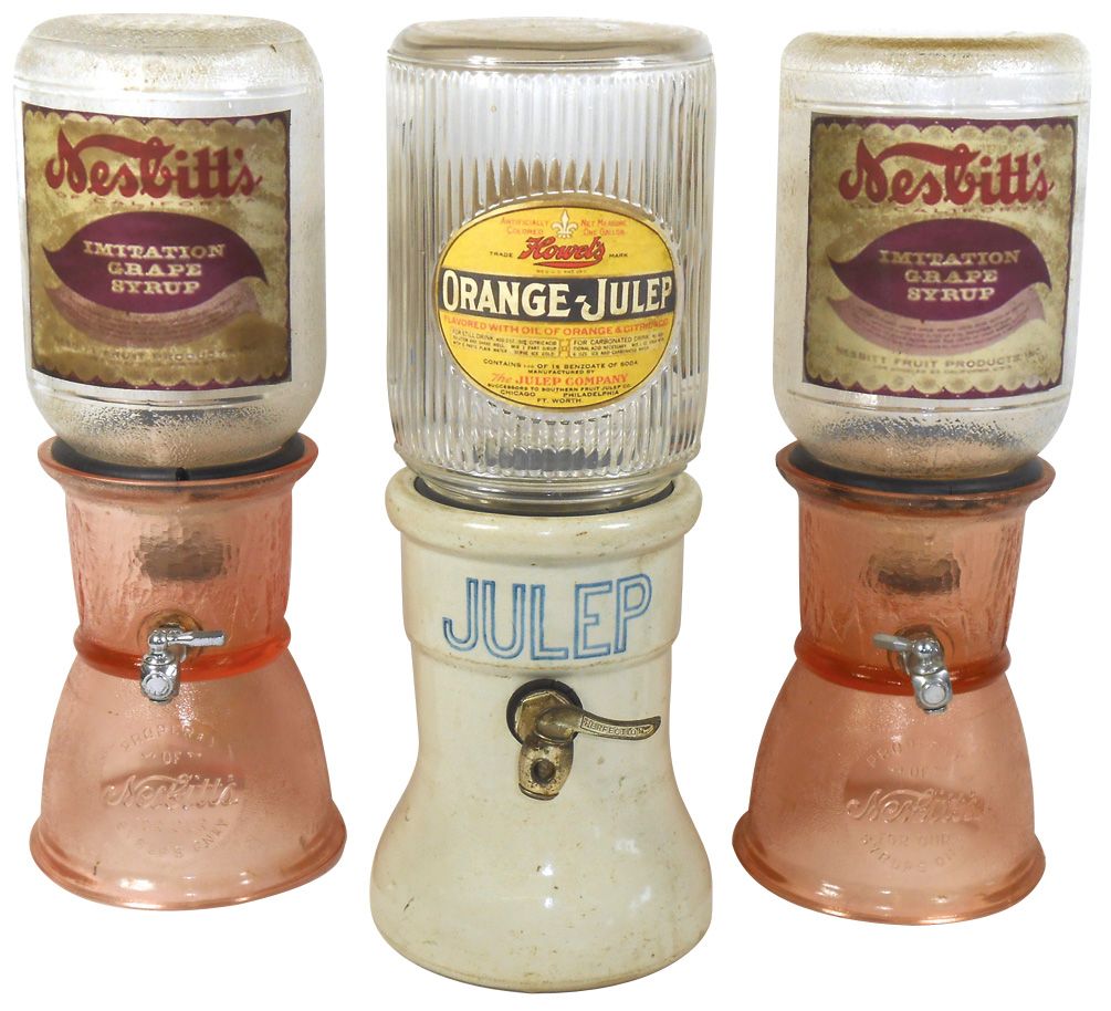 Syrup dispensers (3), 2 Nesbitt's, both w/pink textured glass bases & emb "Property of Nesbitt's-For Our Syrup Only" & Julep stoneware dispenser, all w/gallon jugs, Julep has hairline crack at back, o/wise all VG cond & 18"H.
