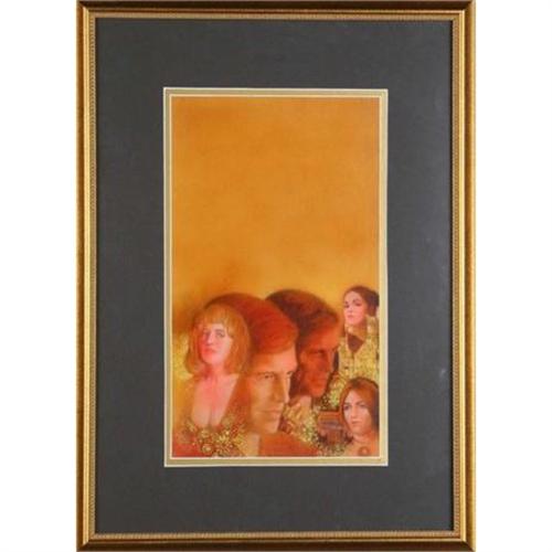 The City is a fantastic drawing by renowned illustrator Gene Szafran. It shows several portraits of men and woman on a background of ochre. They are dressed in fabulous clothing. A Rolls Royce and a cathedral are also shown. This could possibly have been a prototype for one of Szafran?s beloved book jackets. The work is double matte din a top mat of charcoal gray with a bottom mat of gold. The frame is an exquisite gold wood frame with a beaded edge. Total size is 16 x 22 inches. Born in Detroit Michigan, Gene Szafran became a noted illustrator for magazines including "Playboy," "Cosmopolitan," "Penthouse," "McCall's," "Fortune," and Bantam Books. He studied and later taught at the art school of the Society of Arts and Crafts in Detroit and also taught at the Pratt Institute in Brooklyn. He then moved to Connecticut as a freelance artist and worked as an illustrator out of New York City. He has personal interests of photography and sculpture that he often incorporates into his illustrations. Recently he has struggled with Multiple Sclerosis. Gene Szafran Painting of a central male / female figure with Multiple arms poised a gainst a royal blue background - Hermaphrodeity - has been auctioned at 1500.00 to 2000.00 by the year 2003 at Winter Associated Inc.