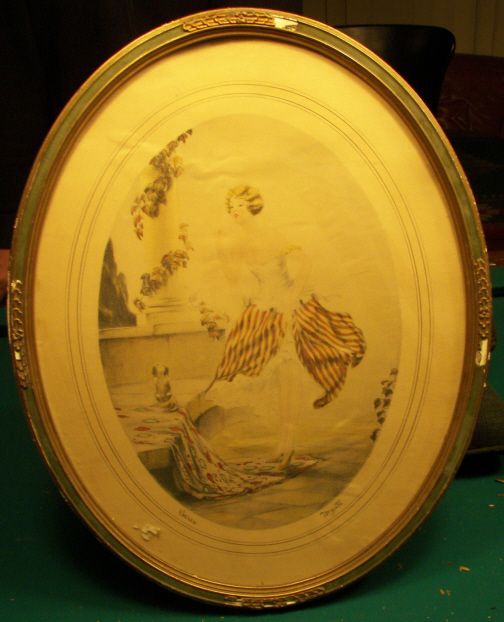 Szauto Cheras, Drypoint etching Szauto Cheras, Drypoint etching, lady with her puppy, Bern Art Corp, N.Y. printed on edge of image,18" x 12", Original oval frame destroyed, Water damage to print,
