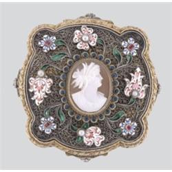 Pest, 1872 - 1922 közötti jeggyel, aranyozott ezüst, "SA" mesterjegy, zsanéros fedél nyitódással, tetején filigrános díszben camea, rubin, zafír és gyöngydísz, festett zománc virágokkal, oldalán achát, br. 184,1g; 8,5*8,5*3,5 cm, betéten abgedekt foglalt hegyikristályok