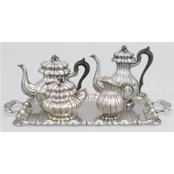Pest, 19. sz. vége, ezüst, hólyagos díszu tagolásokkal, rózsa nyitóval, fa füllel, tálca, -teás -kávés -tejes kiönto, cukortartó, 4691,1 g, m: 25 cm