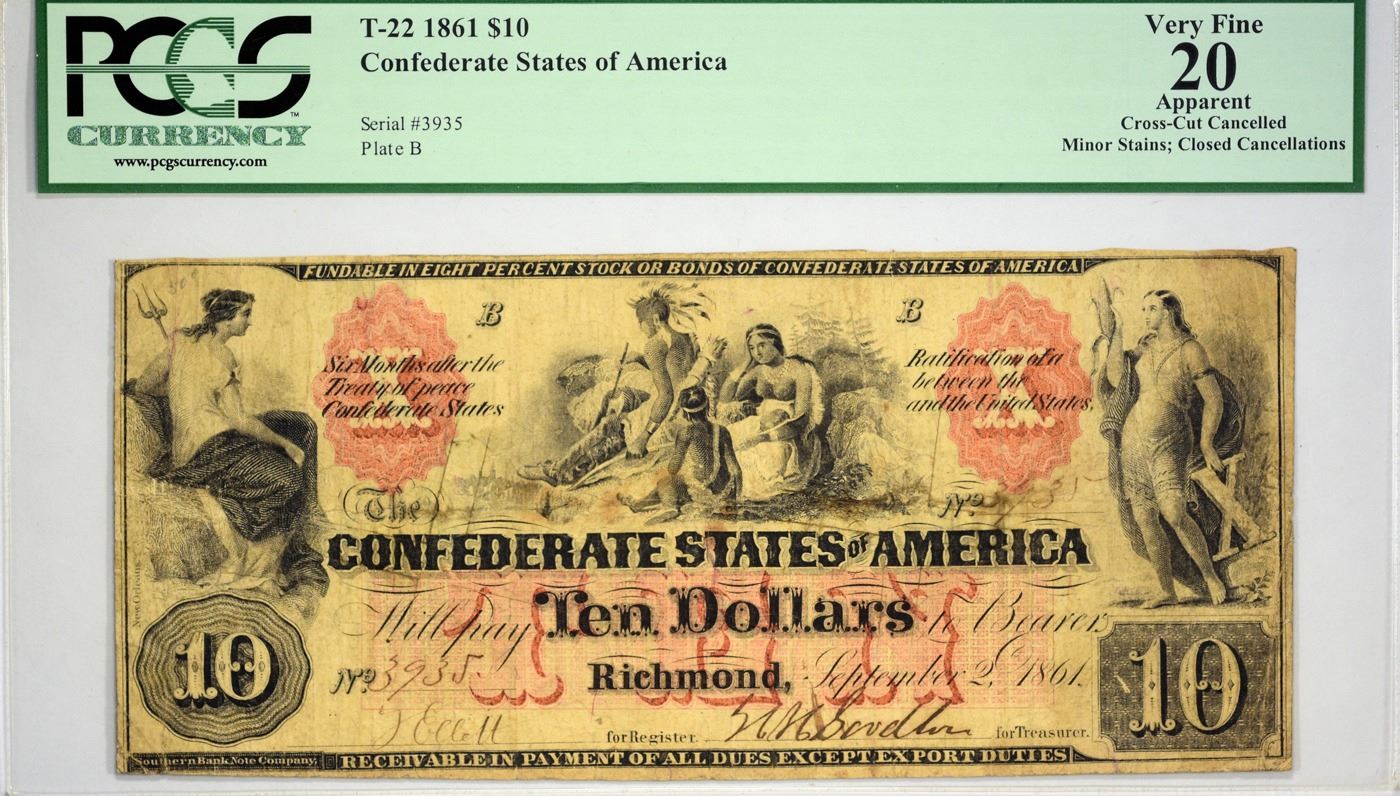 T-22. 1861 $10 Confederate Currency. PCGS Very Fine 20 Apparent. Cross-Cut Cancelled, Minor Stains; Close Cancellations. Attractive orange inks remain and the overall appeal is nice. Still bold penned details and the mentioned problems by PCGS Currency do not drastically affect the look of the important face of the note. Rare any finer.