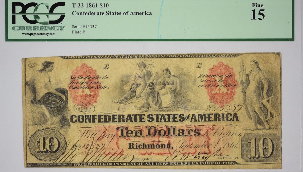 T-22, PF-1. 1861 $10 Confederate Note. PCGS Fine 15.
