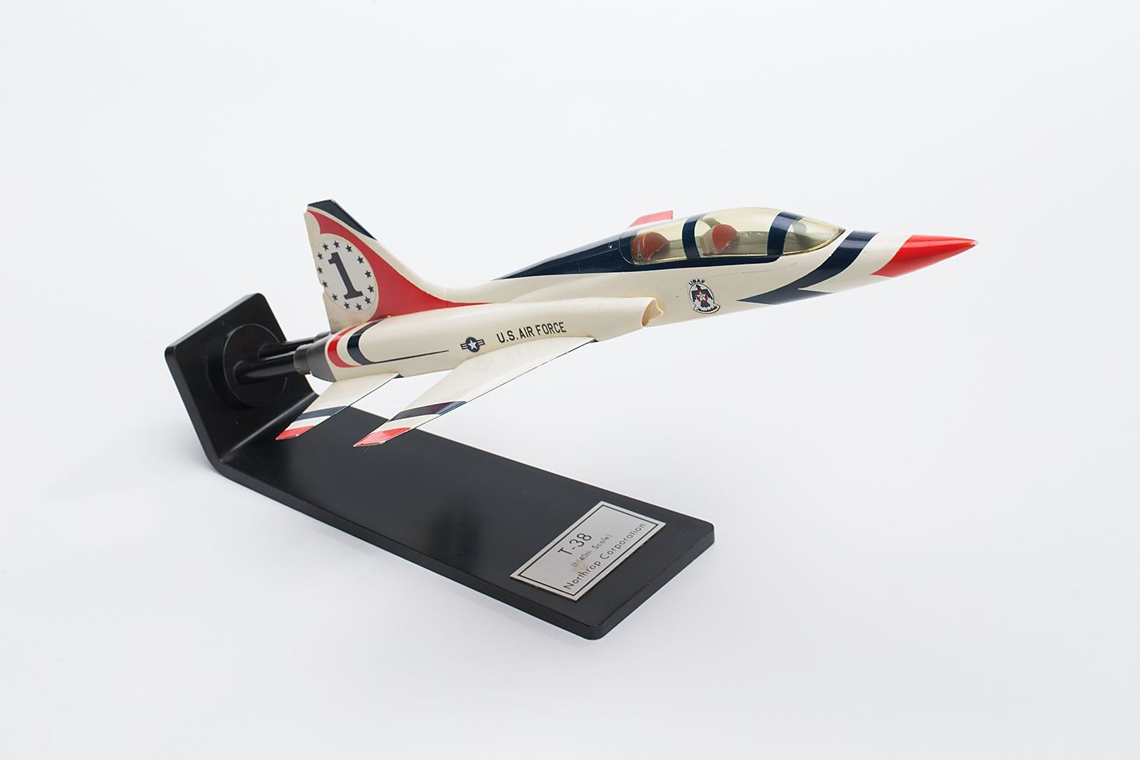Vintage 1:40 scale contractor's model of a Northrop T-38 Talon, measuring 13? in length, with bold colors and US Air Force decals. The model is attached to its 8.5 x 3 plastic base with information plate, with nose of model raised to a height of 7.5?. In fine condition, with trivial scuffs and peeling to decals.
