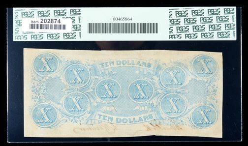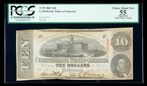 T-59 1863 $10. PCGS Choice About New 55 Apparent. Minor paper toning resulted in the Apparent grade on this otherwise attractive Confederate $10.