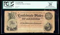 T-64 1864 $500. PCGS Very Fine 20 Apparent. The well-known "In Memoriam" poem is found on the back of this Confederate $500. Edge tears and damage resulted in the Apparent grade.