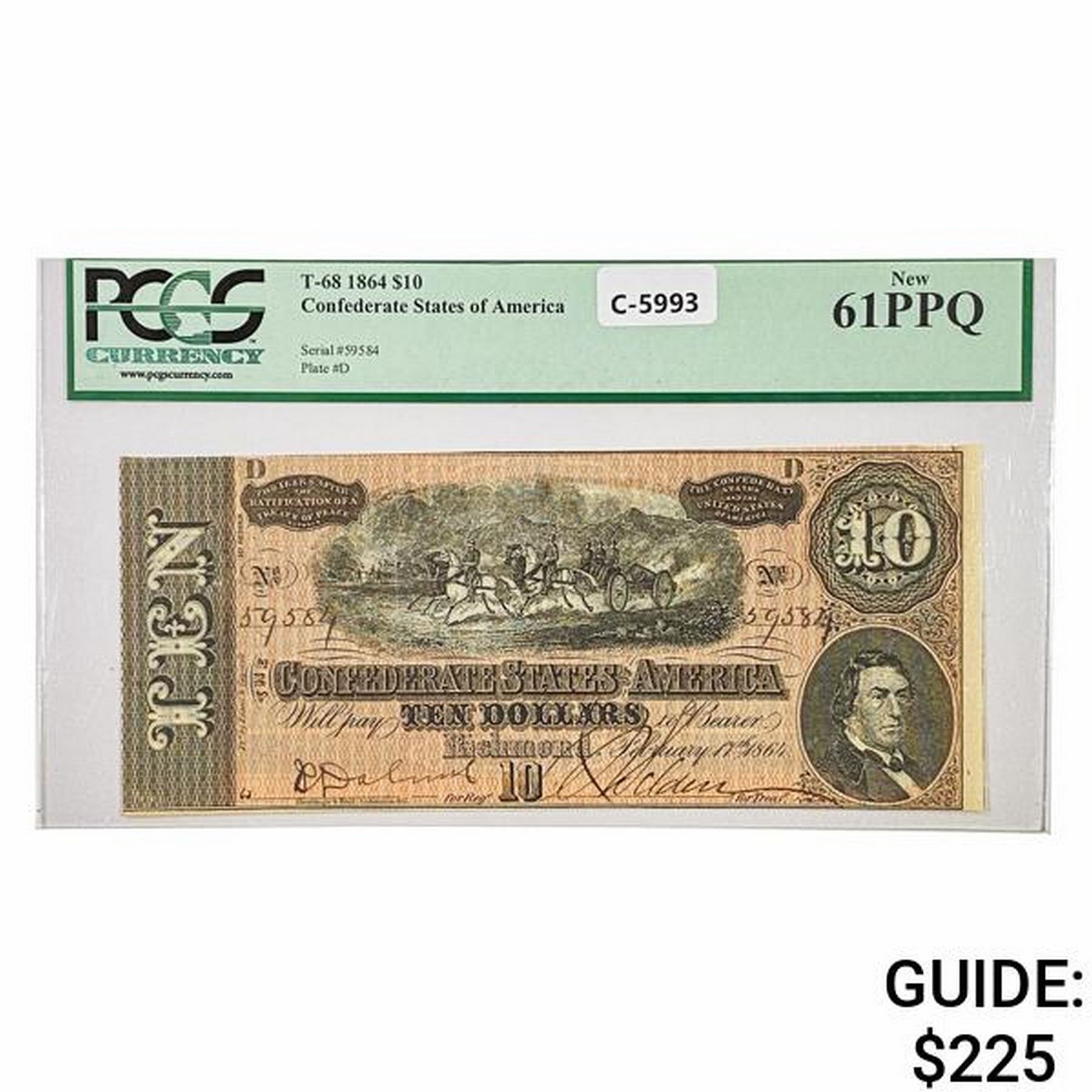 T-68 1864 $10 TEN DOLLARS CSA CONFEDERATE STATES OF AMERICA PCGS UNCIRCULATED-61PPQ
