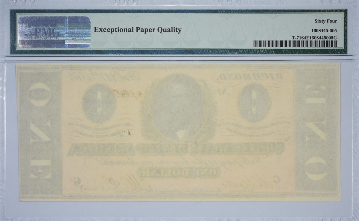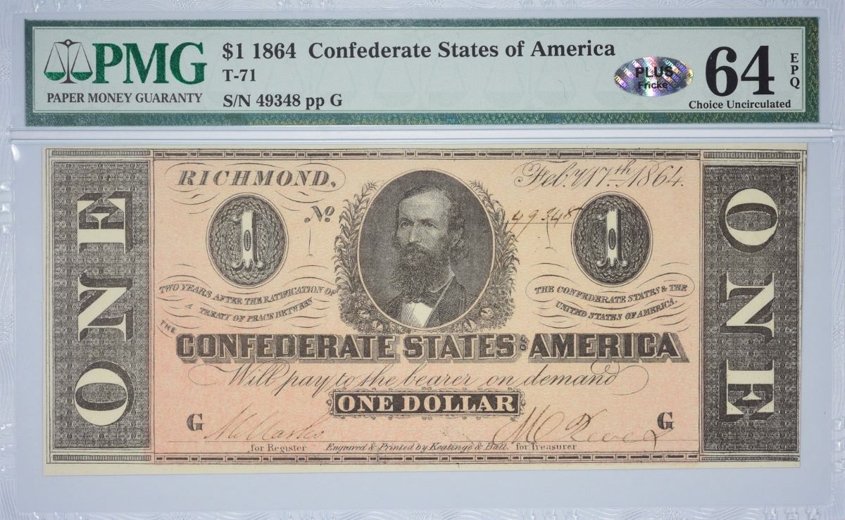 T-71, PF-1. 1864 $1 Confederate Note. PMG Choice Uncirculated 64 EPQ.