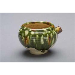 Very finely san t'sai splash glazed, Chinese T'ang Dynasty, water dropper of fine form and with good, bright glaze color (tiny rim repairs and glaze lacquered), D: 4 1/2"