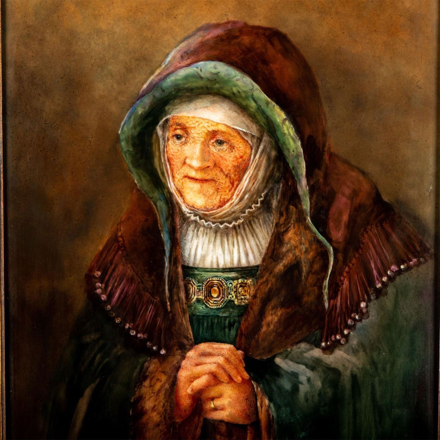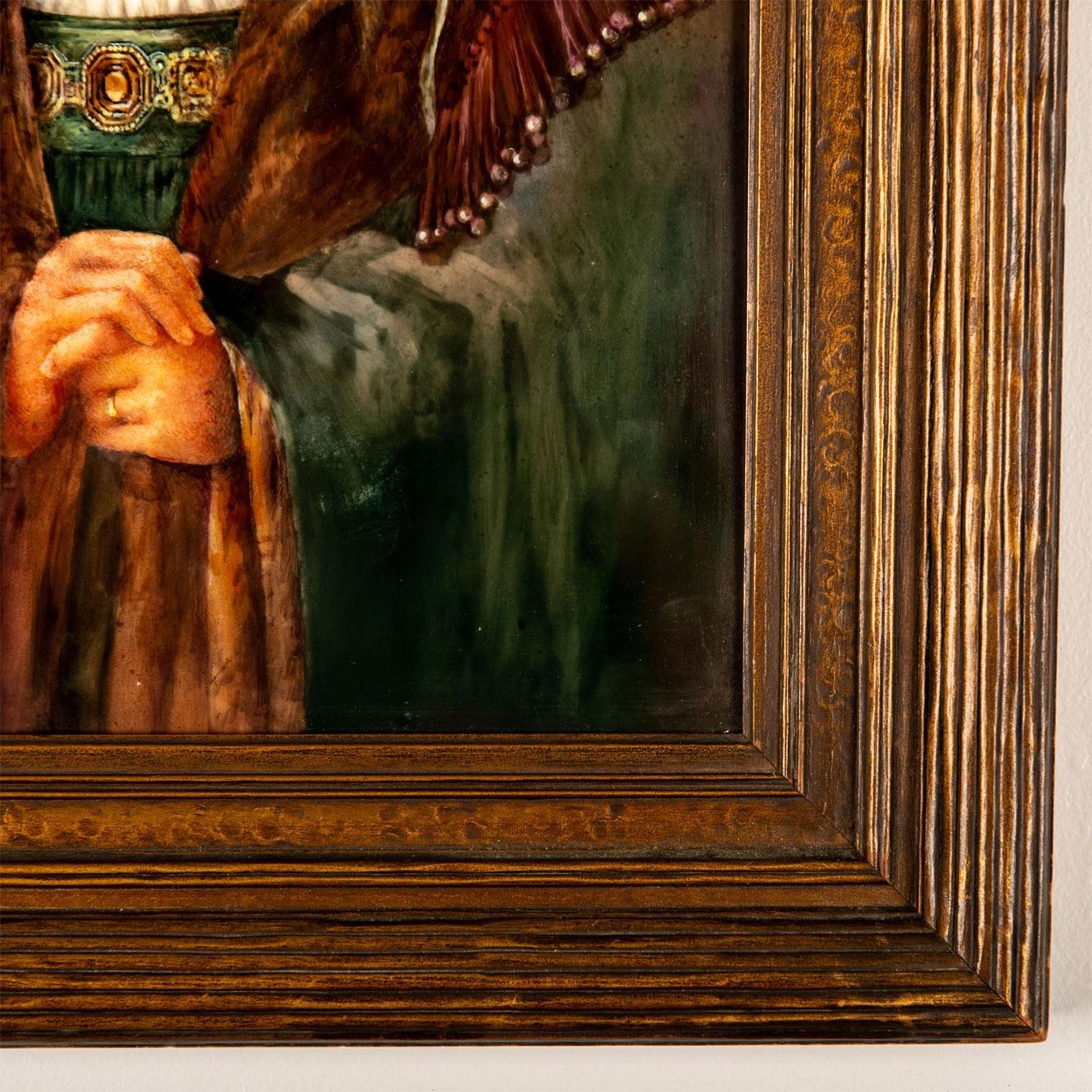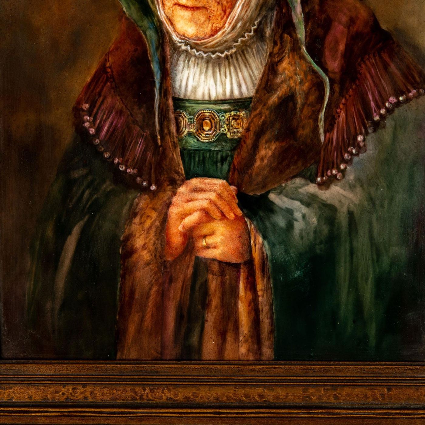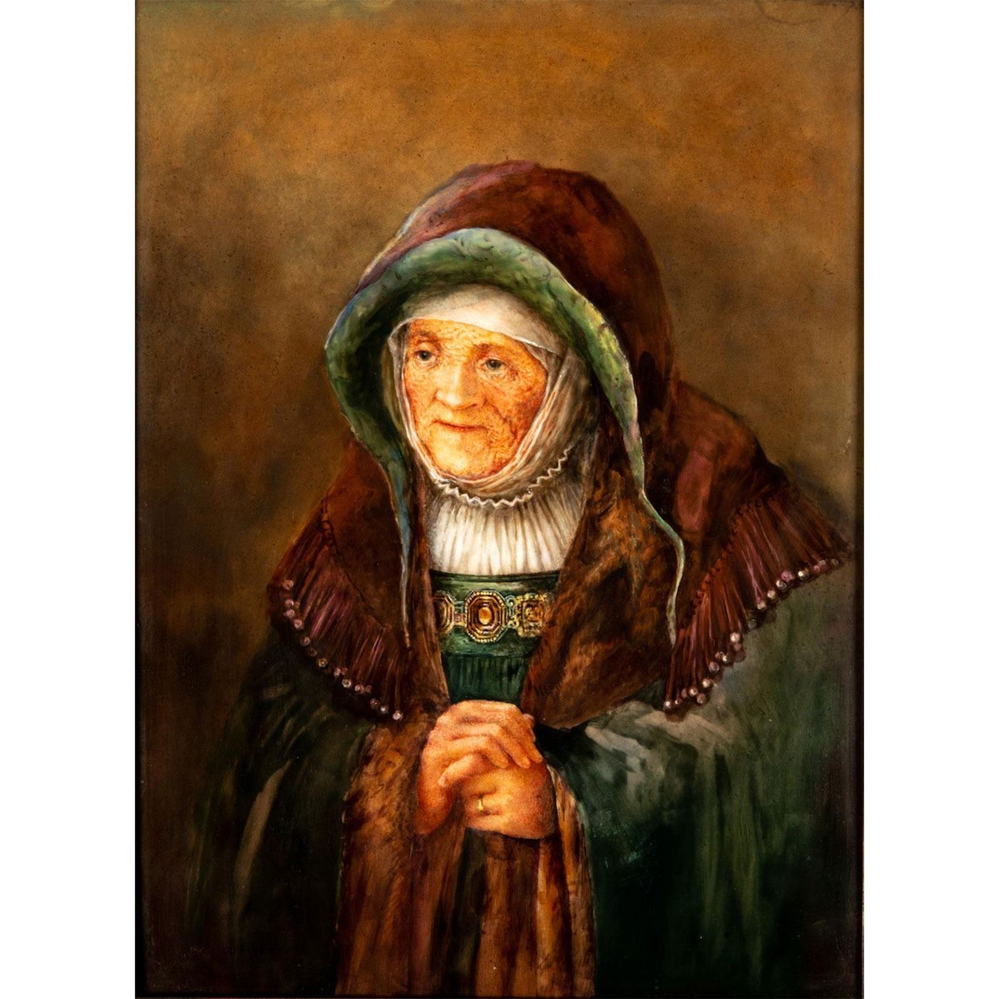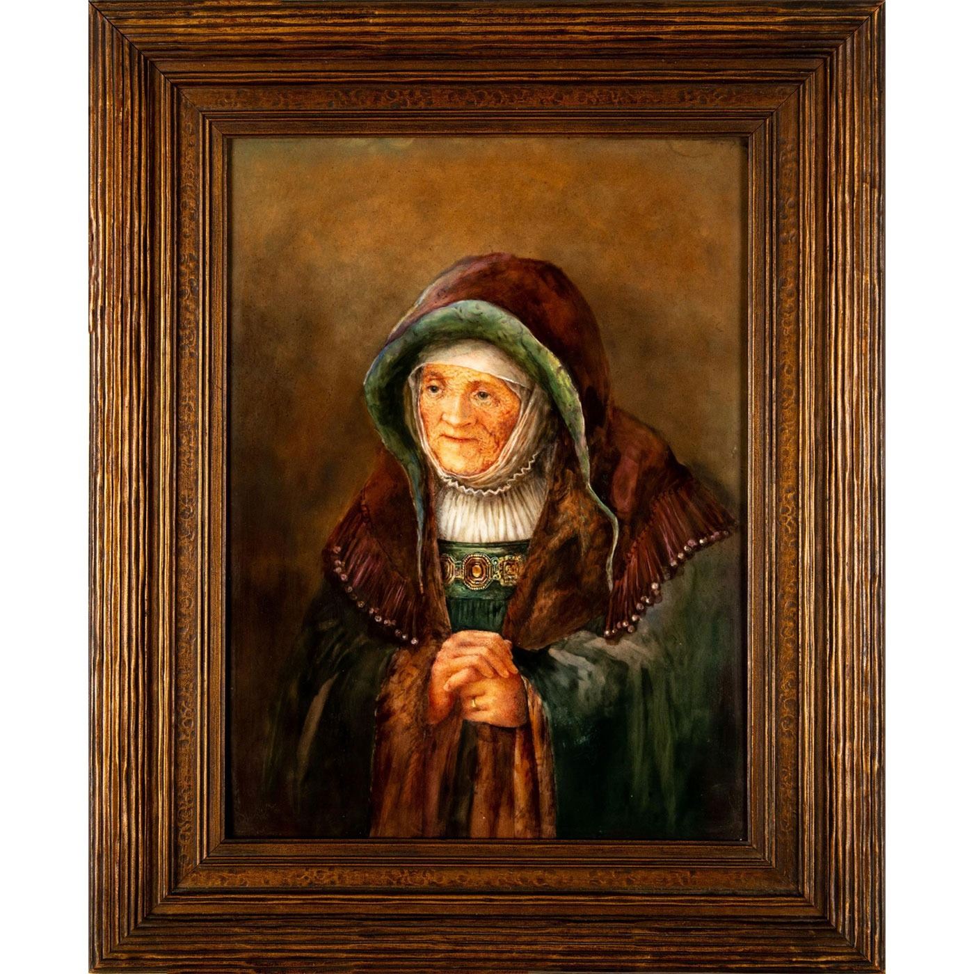 French ceramic plaque pf the Anna After Rembrandt van Rijn. Housed in wooden frame. Sight size: 16"H x 11.5"W. Frame: 21.75"H x 17.5"W. #artplaque #decor