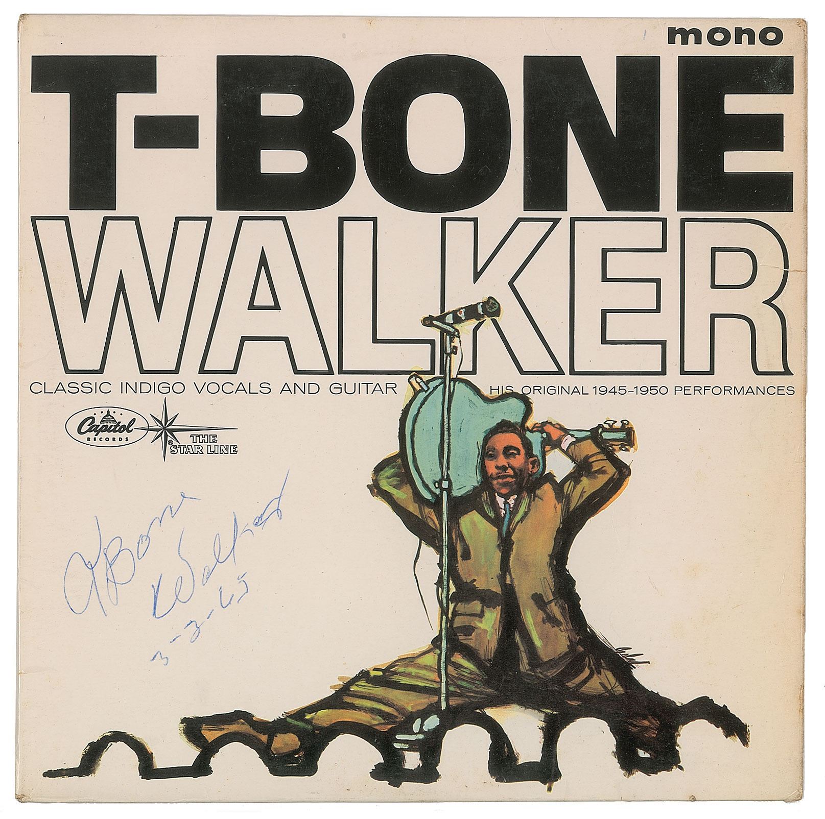 T-Bone Walker: Classic Indigo Vocals and Guitar album signed on the front cover in blue ballpoint, "T Bone Walker, 3-3-65." In very good to fine condition, with a short tear to the right edge, and light staining to the back cover. The record is not included.