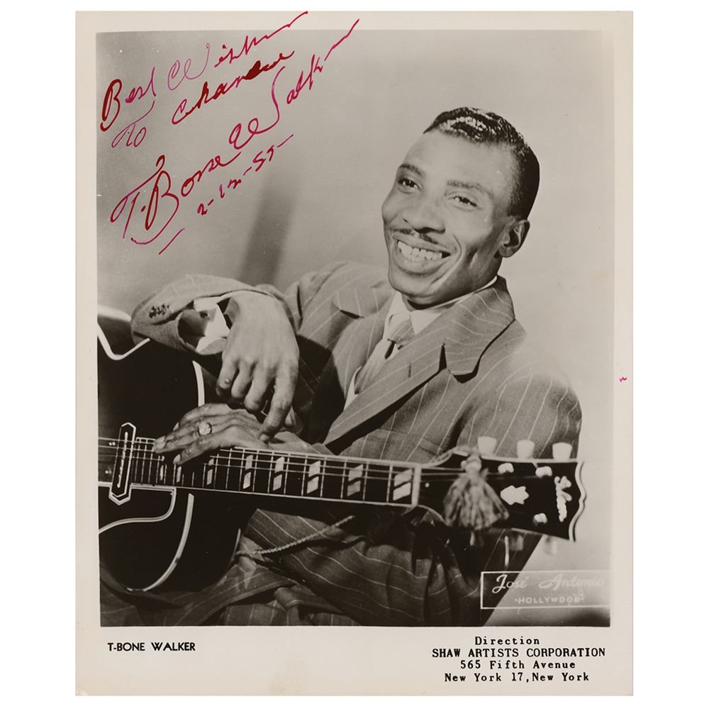 Vintage glossy 8 x 10 publicity photo of Walker by Jose Antonio of Hollywood, signed and inscribed in bold red fountain pen, "Best wishes to Charles, T. Bone Walker 2-12-59." In fine condition, with some pooling of the ink in the inscription.