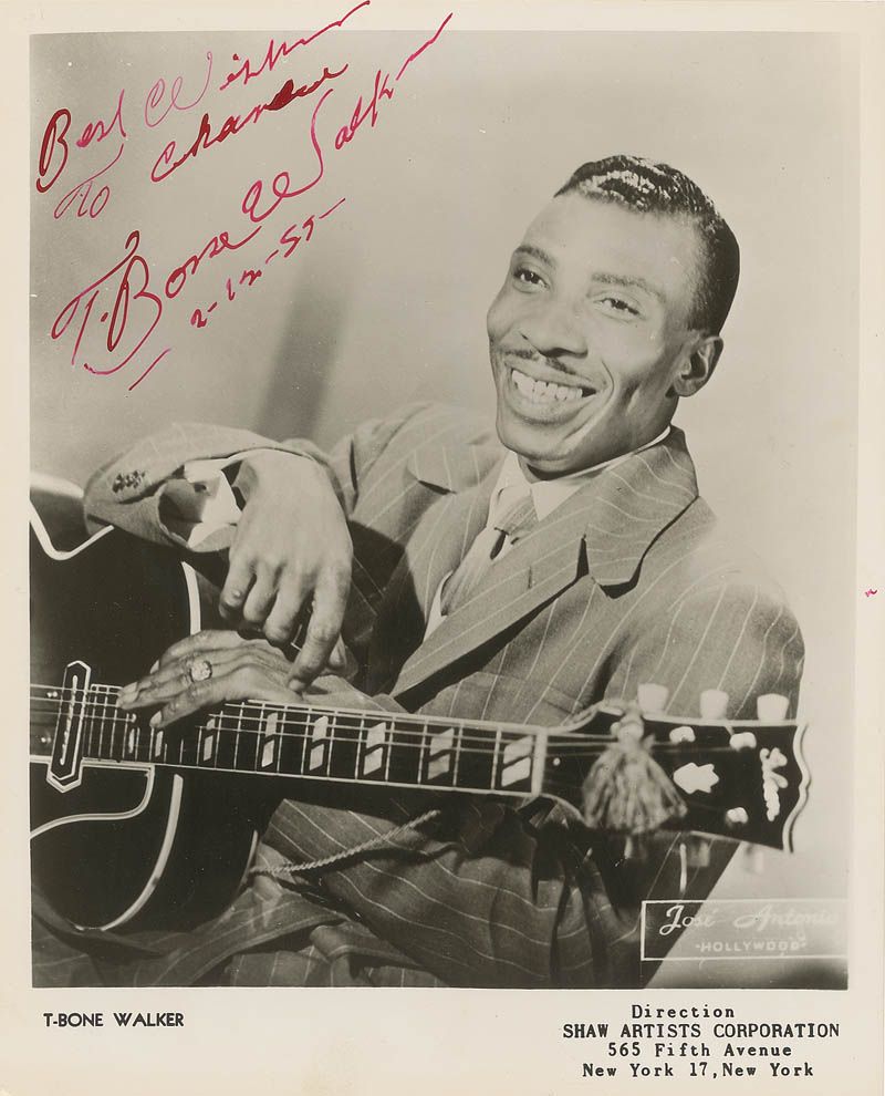 Influential blues musician (1910–1975) best known for his role as a pioneer of the electric guitar. Vintage glossy 8 x 10 publicity photo, signed and inscribed in red fountain pen “Best wishes to Charles, T. Bone Walker 2-12-59.” In fine condition, with some scattered light creases and surface marks and some light pooling of ink to inscription.
