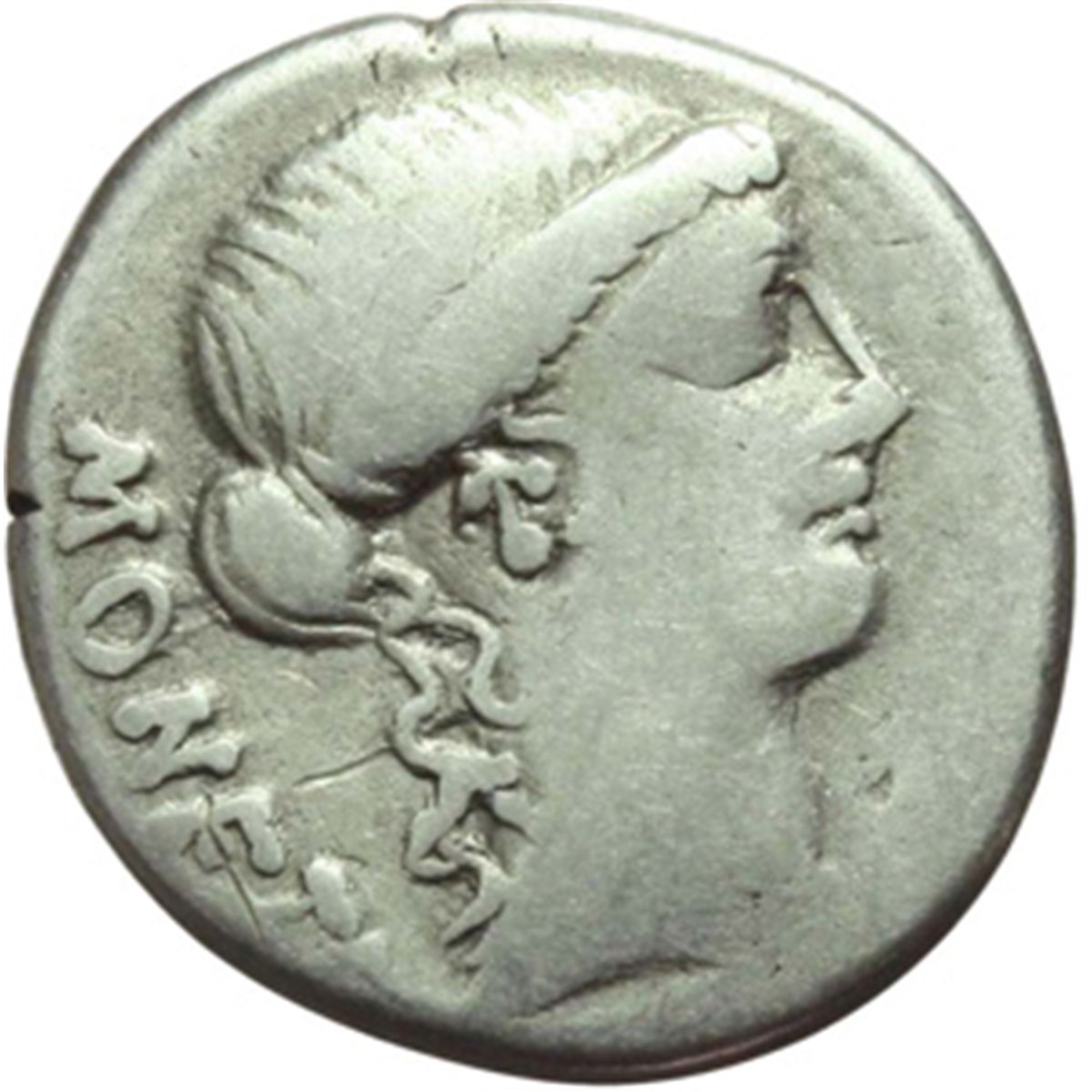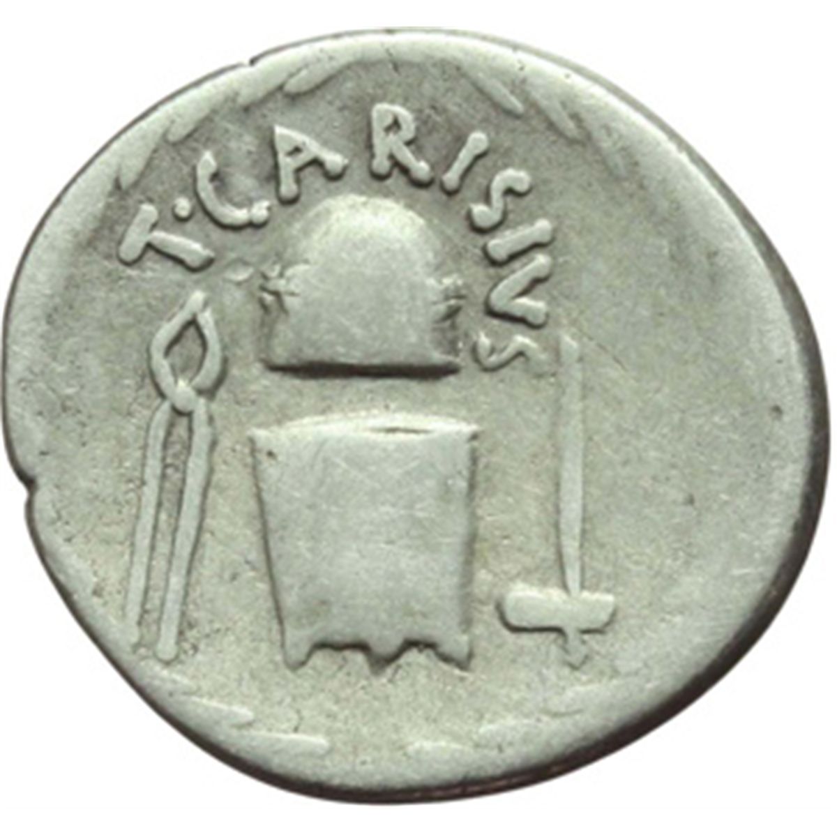 Repubblica Romana. T. Carisius. Denario, 46 a.C. D/ MONETA. Testa di Iuno Moneta a destra. R/ T. CARISIVS. Gli strumenti della zecca: Il conio su incudine, tra tenaglie e martello. Cr. 464/2. B.1. AG. g. 3.43 mm. 18.00 qBB/BB.