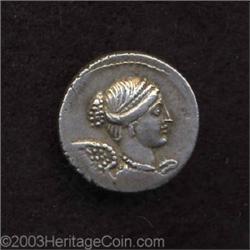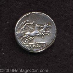 <TABLE cellSpacing=0 cellPadding=0 width="100%" bgColor=#000000 border=0><TBODY> <TR><TD width="100%"><TABLE cellSpacing=1 cellPadding=3 width="100%" border=0><TBODY><TR><TD width="100%" bgColor=#79735c><FONT face=arial color=#ffffff size=3><B>Description</B> </FONT></TD></TR><TR><TD width="100%" bgColor=#ffffff><FONT face=arial size=2><B>T. Carisius.</B></I> 46 B.C. AR denarius (19 mm, 4.17 g). Diademed bust of Victory right / Victory driving biga right. Crawford 464/4; HCRI 72; Sydenham 986; Carisia 2. Toned VF.<BR><I>The types on this coin which portray the goddess Victory on both obverse and reverse refer to Caesar's recent successes in Africa.</B></I> </FONT></TD></TR></TBODY></TABLE></TD></TR></TBODY></TABLE><BR><A name=PricesRealized></A><TABLE cellSpacing=0 cellPadding=0 width="100%" bgColor=#000000 border=0><TBODY><TR><TD width="100%"><TABLE cellSpacing=1 cellPadding=3 width="100%" border=0><TBODY><TR><TD width="100%" bgColor=#79735c><A name=PR><FONT face=arial color=#ffffff size=3><B>Previous Prices from Heritage Auctions</B> </FONT></A></TD></TR><TR><TD bgColor=#f6f6ed>No Prior Data Recorded </TD></TR><TR><TD bgColor=#ffffff><FONT face=arial size=1 ?>PLEASE NOTE: All prices realized reflect the final hammer price PLUS the buyer's premium in auctions that charge a buyer's premium. Each item has a notation at the top of the listing indicating whether that lot included a buyer's premium. Example: A item that sells with a final hammer price of $100 and a 20% buyer's premium will display with a price realized of $120. All information listed is intended to be as accurate as possible, but errors are possible. Please use this guide carefully and inform us of any inaccuracies. </FONT></TD></TR></TBODY></TABLE></TD></TR></TBODY></TABLE><BR><TABLE cellSpacing=0 cellPadding=0 width="100%" bgColor=#000000 border=0><TBODY><TR><TD width="100%"><TABLE cellSpacing=1 cellPadding=3 width="100%" border=0><TBODY><TR><TD width="100%" bgColor=#79735c colSpan=6><FONT face=arial color=#ffffff size=3><B>Price Guide*</B> </FONT></TD></TR><TR bgColor=#f6f6ed><TD align=middle><B>Grade</B> </TD><TD align=middle><B>Coin World<BR>(Trends)</B> </TD><TD align=middle><B>Numismedia<BR>Retail</B> </TD><TD align=middle><B>Numismedia<BR>Wholesale</B> </TD><TD align=middle><B>Coin<BR>Universe</B> </TD><TD align=middle><B>Heritage<BR>Value Index</B> </TD></TR><TR bgColor=#ffffff><TD colSpan=6><FONT size=1>*All information listed is intended to be as accurate as possible, but errors are possible. No item may be returned or refused based on this information which is provided as a service to our customers. You should contact each pricing source directly to determine the accuracy of this information. </FONT></TD></TR></TBODY></TABLE></TD></TR></TBODY></TABLE><BR><TABLE cellSpacing=0 cellPadding=0 width="100%" bgColor=#000000 border=0><TBODY><TR><TD width="100%"><TABLE cellSpacing=1 cellPadding=3 width="100%" border=0><TBODY><TR><TD width="100%" bgColor=#79735c><FONT face=arial color=#ffffff size=3><B>Population Guide</B> </FONT></TD></TR><TR bgColor=#ffffff> Important notice: Heritage usually auctions material at the rate of 200-250 lots per hour. On some occasions eBay Live bid software or the Internet may not be able to keep up with the pace of the auction. We recommend placing a realistic absentee bid now as insurance to avoid disappointment. Occasionally the auctioneer may eliminate or reject an eBay Live bid, and the auctioneer may also reopen a lot after the close of the eBay live bidding (usually because we missed an audience bid), and may reject your bid even if it shows you as the winning bidder. By bidding via eBay Live, you agree that Heritage may award the lot to another bidder at its sole discretion under the circumstances described above or any other reasonable circumstances. Also please note that all Heritage lots purchased through eBay Live carry a 20% Buyer's Premium. Please make sure you read the Terms and Conditions before you bid.</TD></TR></TBODY></TABLE></TD></TR></TBODY></TABLE>