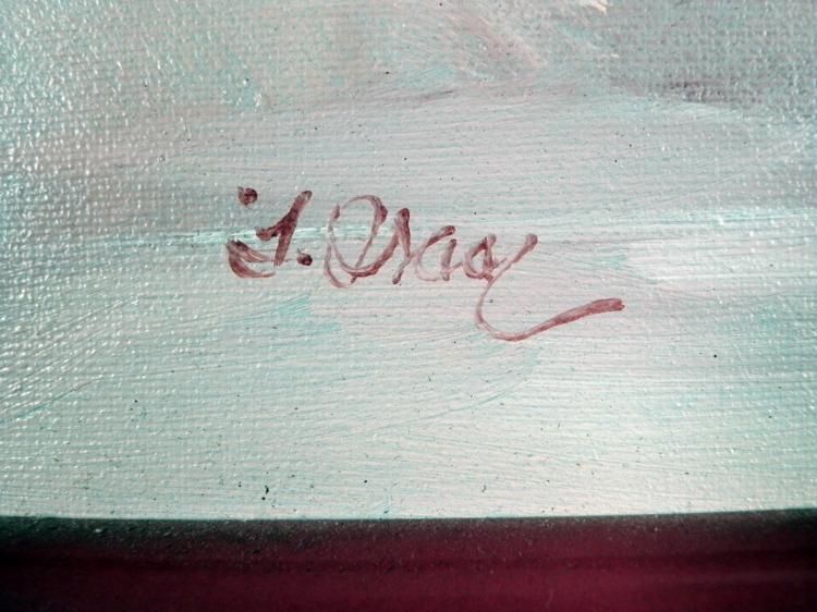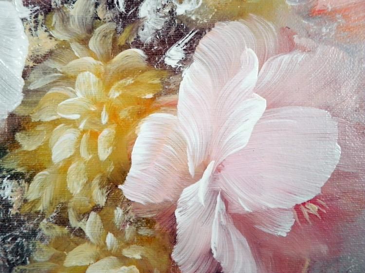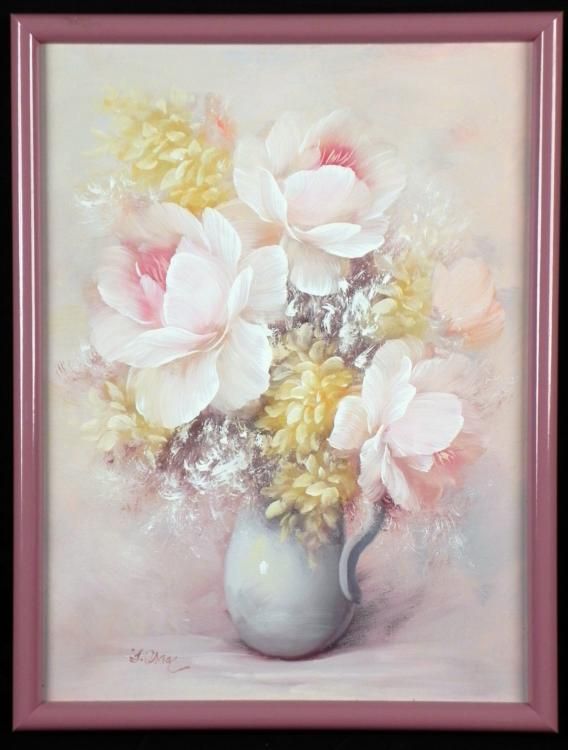 Here is a painting of pretty pink and yellow flowers in a blue vase, with pink casting a hue over the background. * Artist: T Charlott Signature: Lower rightMedium: Acrylic on canvasImage size: 11 3/4 x 15 1/2 inchesFraming: In coral pink laminate frame Frame size: 13 x 17 inchesCondition: Excellent