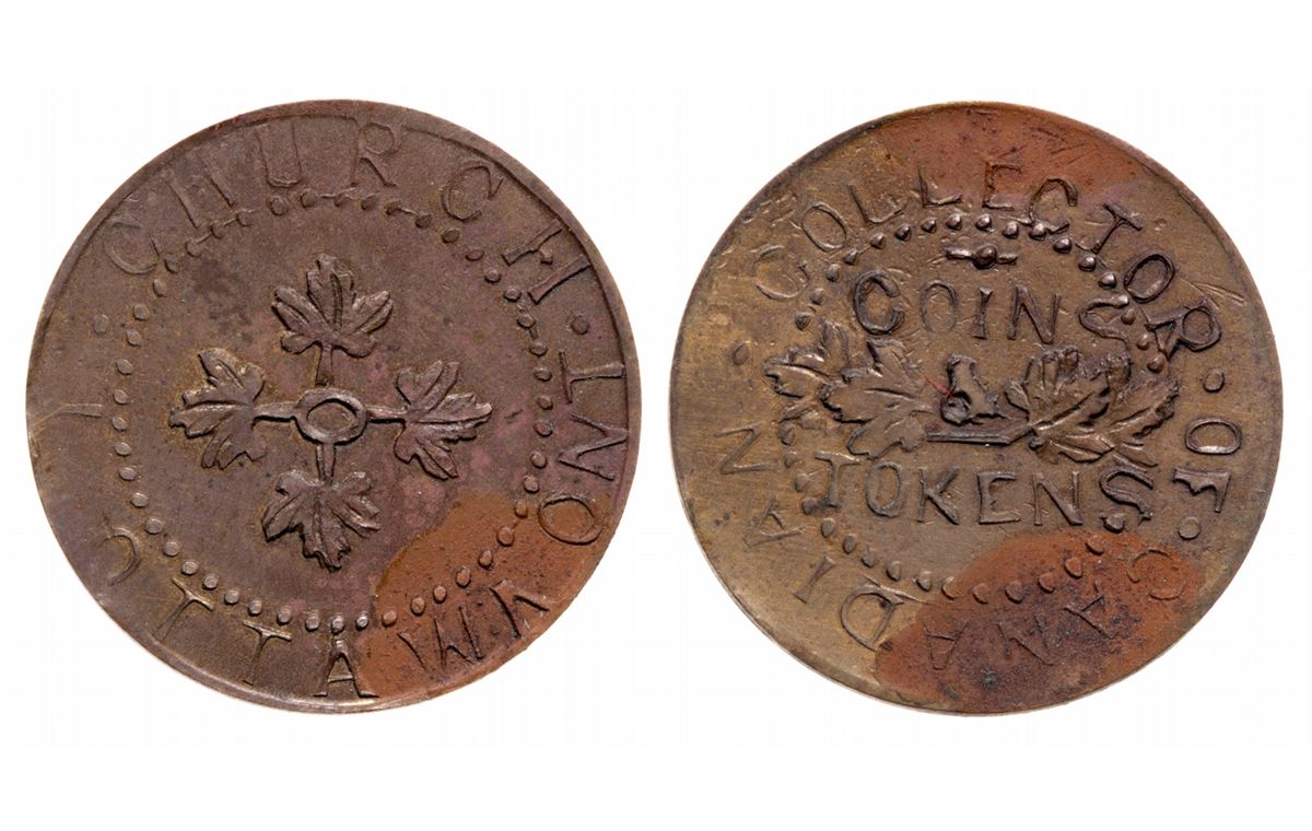 T. Church. Ottawa, Ont. Collector of Canadian Coins. Bowman-8-27. Copper. Plain edge. Medium thick. 7.0 gms. Unc. 20% luster. Some heavy toning areas.