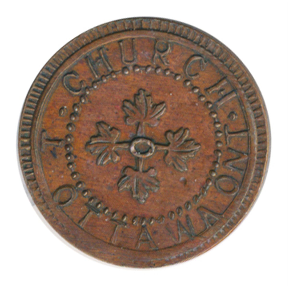 T. Church Token. Bow. 7-24. Copper. Plain edge. Thin. 7.3 gms. AU. Brown.