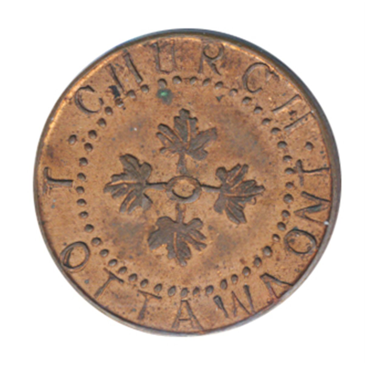 T. Church Token. Bow. 8-27. Copper. Plain edge. Thin. 4.4 gms. UNC. 60% luster.