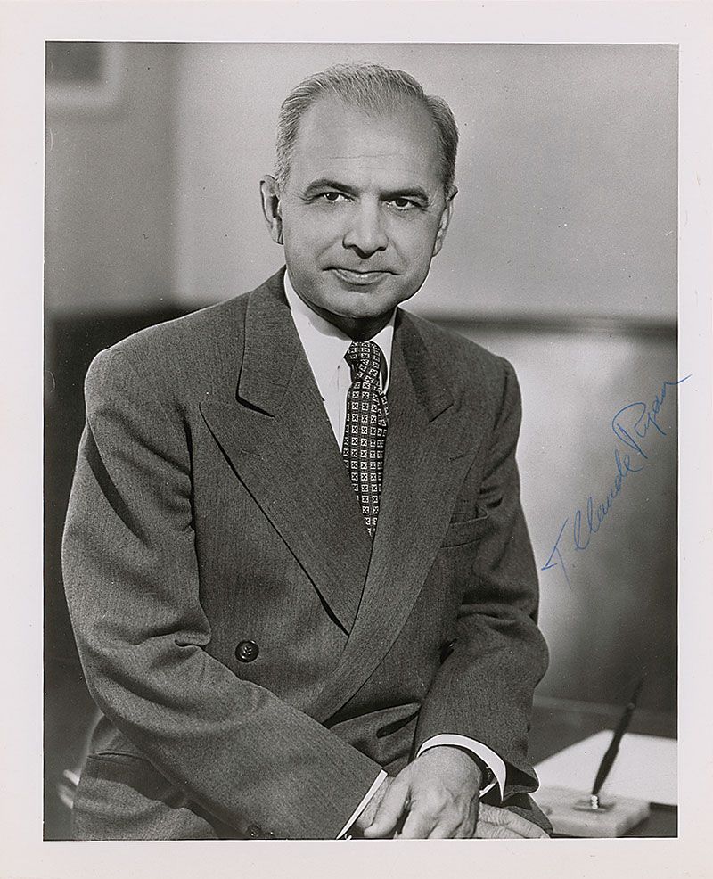 American aviator and executive (1898–1982) whose company produced, amongst other notable aircraft, Lindbergh’s Spirit of St. Louis. Glossy 8 x 10 official portrait of Ryan in a suit and tie, signed in blue ballpoint. In fine condition, with a light crease