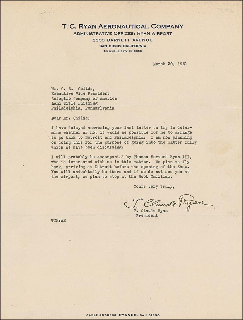 American aviator and executive (1898–1982) whose company produced, amongst other notable aircraft, Lindbergh’s Spirit of St. Louis. Two items: a 5.5 x 3.5 fiftieth anniversary postcard photo of Charles Lindbergh, Donald Hall (designer), Mr. Edwards, and Col. Graham posing with the Spirit of St. Louis shortly before take off from Dutch Flats, CA, to Roosevelt Field in NY on May 20,1927 to win the Orteig Prize. Charles broke two records on this flight, The Worlds Record for flight time from San Diego to St. Louis May 10-11 1927, and again broke the record from St. Louis to New York for his final adventure. Signed on both sides in blue ballpoint by Ryan; and a one-page TLS on Ryan Aircraft Corporation letterhead, dated March 30, 1931, to Mister Childs discussing a new building project and the possibility of most likely meeting at an air show. In fine condition, with a light shade of toning to letter, as well as a single staple hole. RRAuction COA.