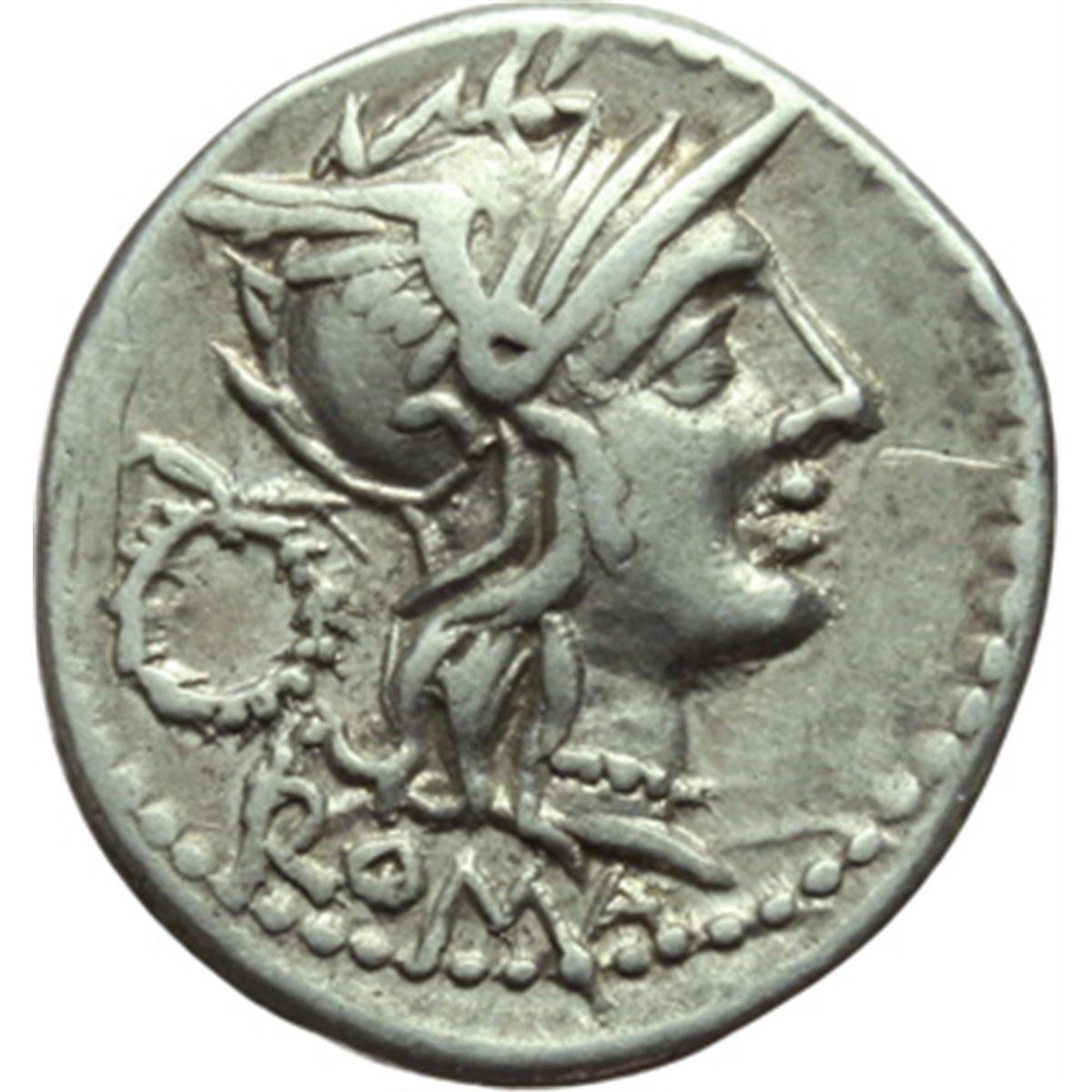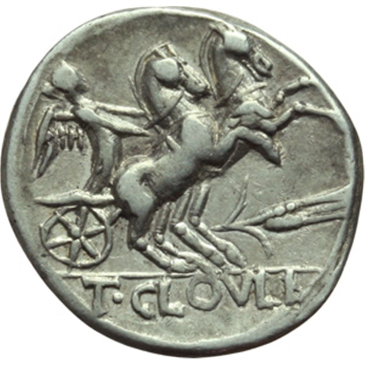 Repubblica Romana. T. Cloelius. Denario, 128 a.C. D/ Testa di Roma a destra. Dietro, corona. Sotto, ROMA. R/ Vittoria in biga a destra. Sotto i cavalli, spiga di grano. In esergo: T. CLOVLI. Cr. 260/1. B.1. AG. g. 3.91 mm. 20.00 Bel BB+. Grande flan, con fondi lucenti.