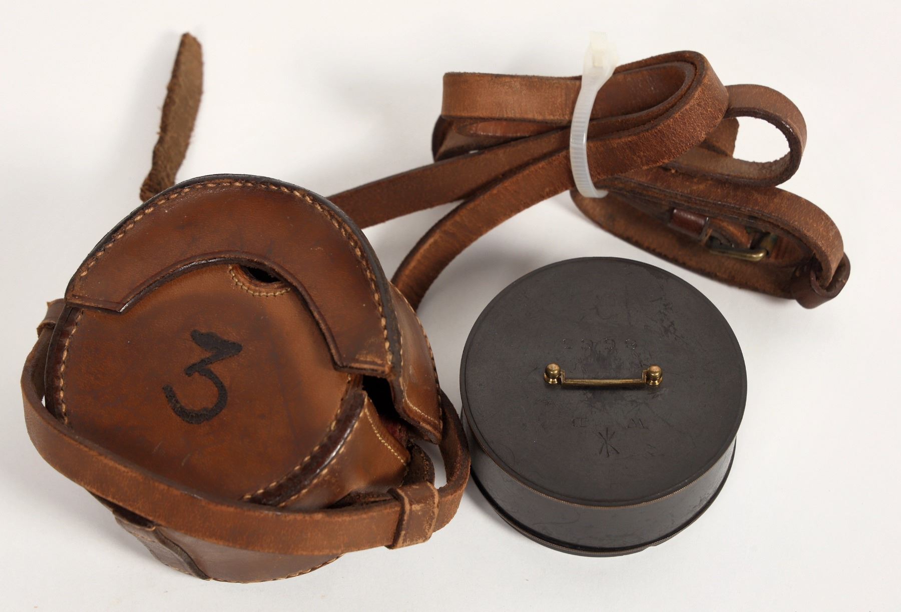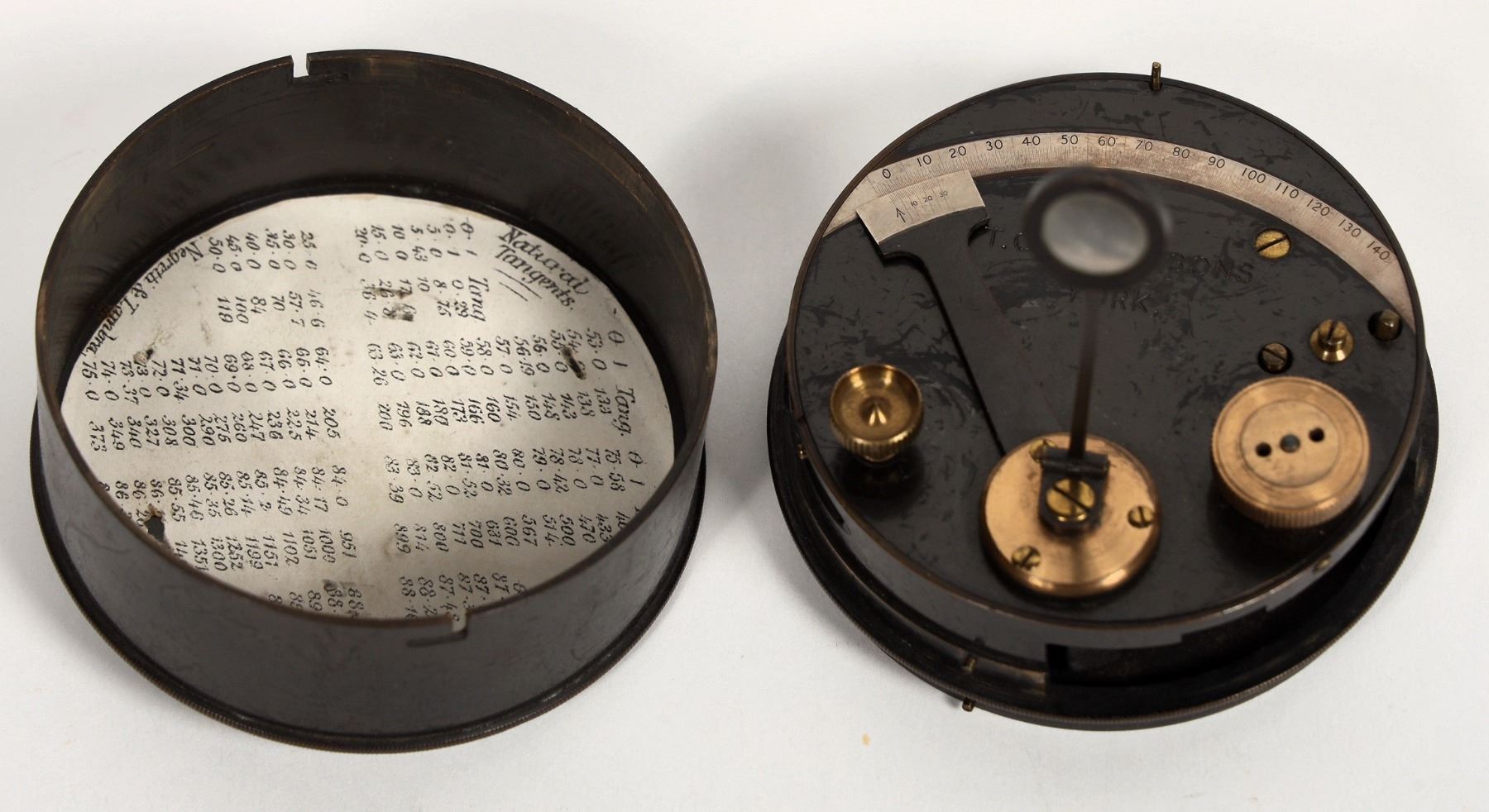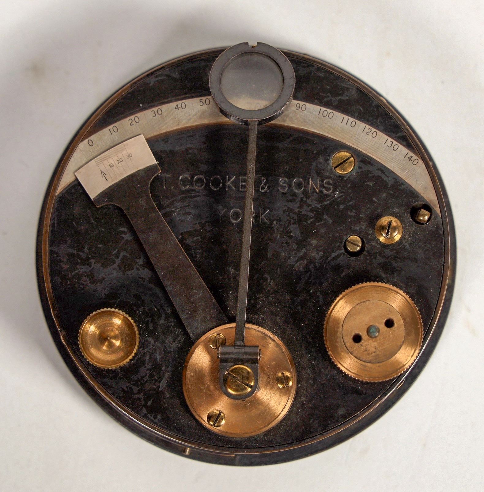 This is a box sextant made by T. Cooke of York. It is marked "WD " with the broad arrow or "crows foot" up and down S/N 8663. This instrument was used before electronic navigation. The broad arrow denoted ownership by the British military. It is complete with leather carry case and the inside cover with tangents. Careful reassembly is required when reboxing. From the Popovich collection. In excellent condition. C. 1900s. About 3 in. diameter. Please see photos for details.