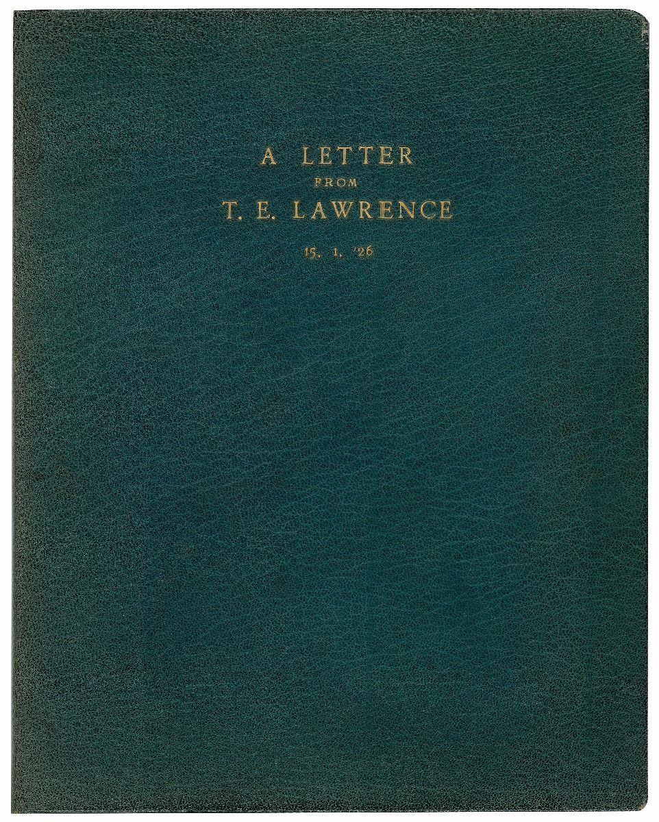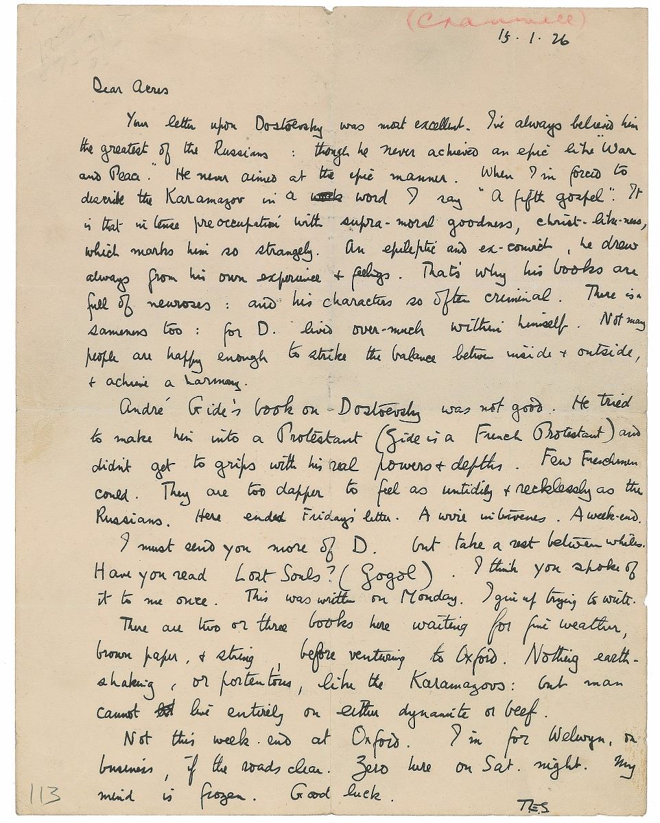 ALS signed “T. E. S.,” one page, 7 x 9, January 15, 1926. Letter to J. B. Acres. In full: “Your letter upon Dostoevsky was most excellent. I’ve always believed him the greatest of the Russians: though he never achieved an epic like War and Peace. He never aimed at the epic manner. When I'm forced to describe The [Brothers] Karamazov in a word I say ‘A fifth gospel.’ It is that intense preoccupation with supra-moral goodness, Christ-like-ness, which marks him so strongly. An epileptic and ex-convict, he drew always from his own experience and feelings. That’s why his books are full of neuroses: and his characters so often criminal. There is a sameness too: for D. lived over-much within himself. Not many people are happy enough to strike the balance between inside and outside, and achieve a harmony.
