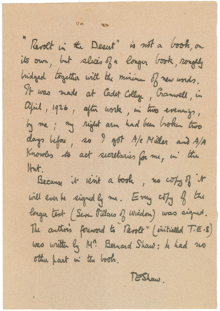 ALS signed "T. E. Shaw," one page, 5.5 x 8, no date. Interesting letter on one of his works. In full: "'Revolt in the Desert' is not a book, on its own, but a slice of a longer book, roughly bridged together with the minimum of new words. It was made at Cadet College, Cramwell. in April, 1926, after work, in two evenings, by me; my right arm had been broken two days before, so I got A/C Miller and A/A Knowles to act as secretaries for me, in the Hut. Because it isn't a book, no copy of it will ever be signed by me, Every copy of the longest text (Seven Pillars of Wisdom) was signed. The author's foreword to 'Revolt' (initialled T. E. S.) was written by Mr. Bernard Shaw: he had no other part in the book." In fine condition.
