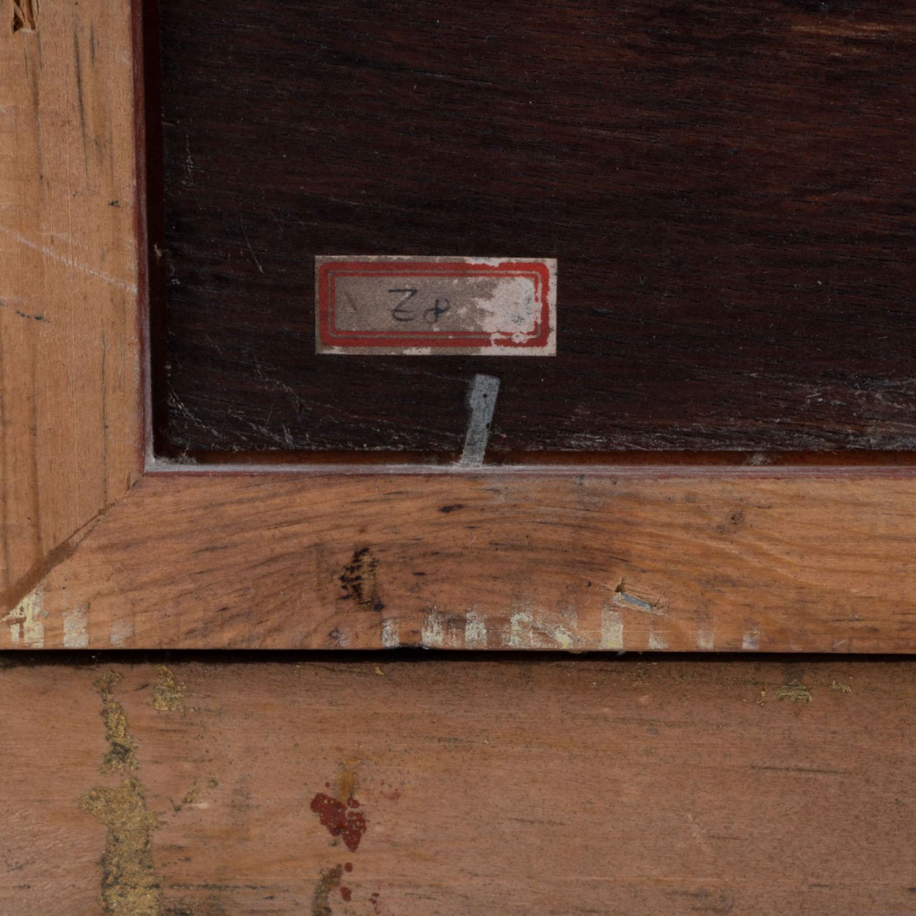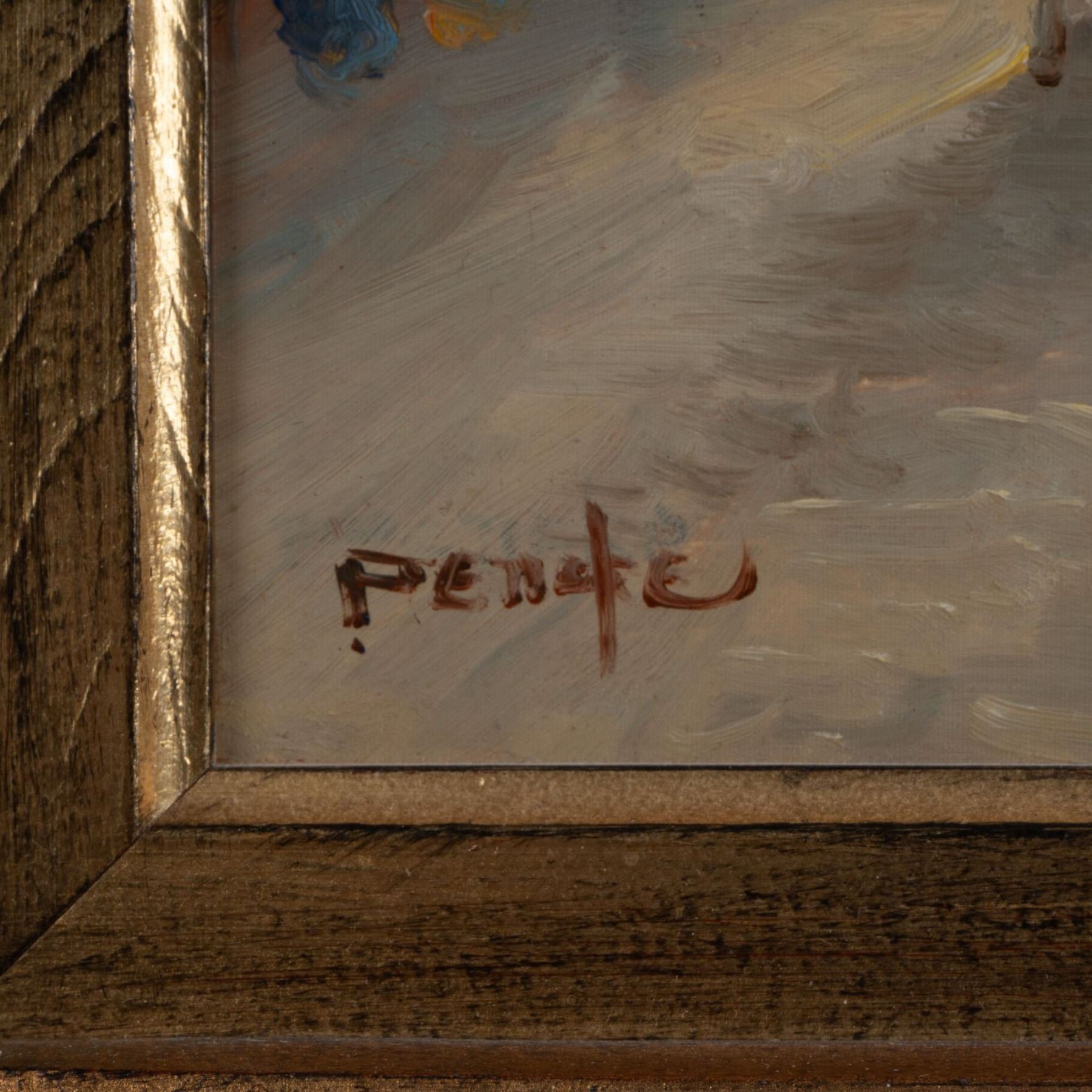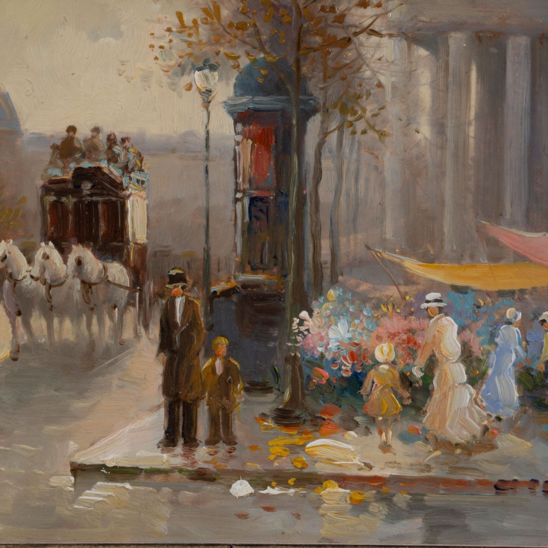 An original Impressionist oil painting on board by French artist T.E. Pencke, renowned for his captivating Parisian cityscapes and Mediterranean seascapes. Pencke portrays a bustling corner of Le Boulevard de la Madeleine, alive with vibrant flower vendors and leisurely strollers, capturing the charm and energy of this lovely scene with a splendid range of colors. Housed in an imposing gilded carved wood frame. Artwork dimensions: 9.50"L x 7.50"H. Frame dimensions: 20.25"L x 18.25"H x 3"W.