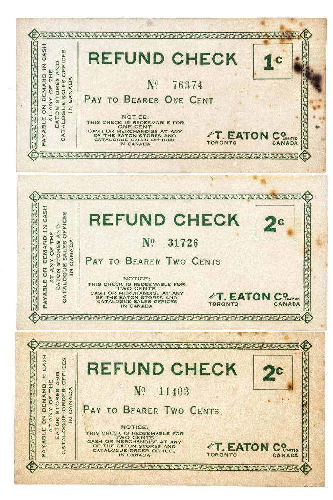 T,.Eaton Co. Canada - Scrip - Lot 3 Refund Checks - 2 x 2 cents, 1 x 1C