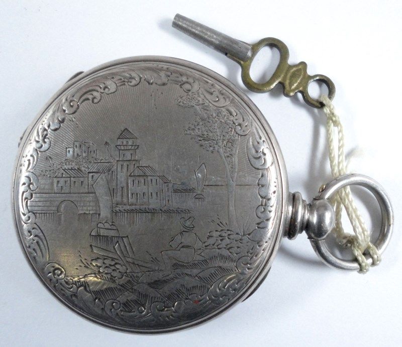EST $250- $300, ANCHOR ESCAPEMENT, THIRTEEN JEWELS, KEY WIND INCLUDES KEY, BEAUTIFUL DIAL / FACE DESIGN, BACK COVER HAS DETAILED ETCHED SCENE, VERY NICE CONDITION