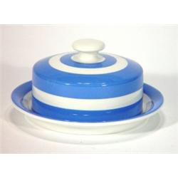 T.G.Green blue banded Cornishware butter dish and cover, green shield to base, 14cm diameter
