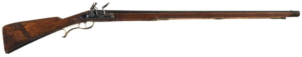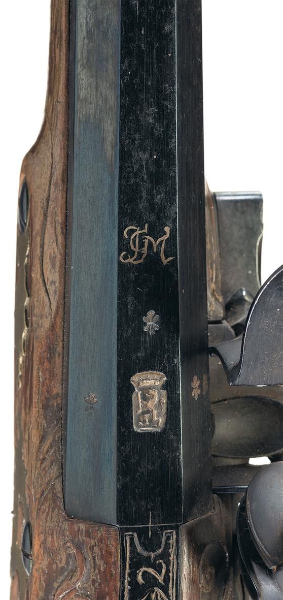 Fitted with a blade front sight, with a pair of fleur-de-lis proof stamps on the chamber, a gold inlaid "TGM" monogram and silver "rampant lion with sword and crown" stamp on the top flat, and "2" engraved on the upper tang. Light floral engraving is present on the lock, with "T.G. MARR" engraved below the flash pan and "KIHNHEID" below the frizzen spring. Fitted with a horn-tipped full length stock, with a ramrod in brass pipes, raised floral carvings around the hand rest trigger guard and raised cheekpiece, a set of brass reverse plates and a brass buttplate. T.G. Marr and Kihnheid have not been identified at this time.