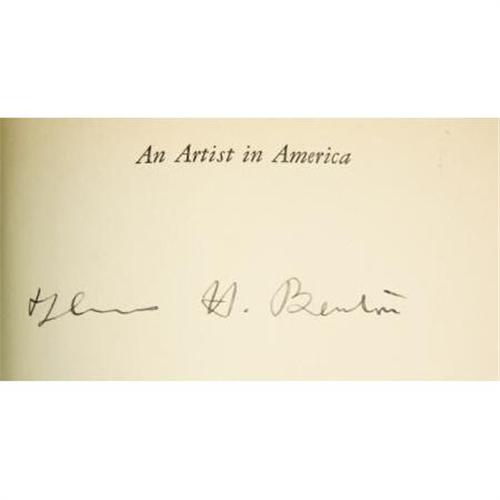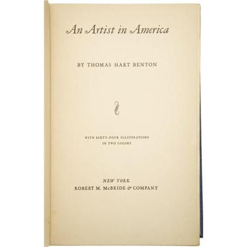 <B>Thomas Hart Benton: Signed First Edition of <I>An Artist in America</B></I>.</B></I> (New York: Robert M. McBride & Company, 1937), first edition, 276 pages, blue cloth binding with gilt lettering on spine and "Benton" blind-stamped on the front cover, 8vo (6.25" x 9.5"), no dust jacket, clear Mylar protective jacket. Deckled fore-edge. Profusely illustrated with 64 Benton pen & pencil sketches. Signed "<I>Thos. H. Benton</B></I>" on the half-title page. <I>An Artist in America</B></I> is Benton's engaging autobiographical meditation on living, working, and traveling throughout the American heartland. A 1937 <I>Newsweek</B></I> book review by Sinclair Lewis is laid-in, in which Lewis lauds Benton's <I>An Artist in America</B></I> as "a report on America which is neither prettified for the local real-estate men nor yet sour with envy of the Europe which is so charming that all of our 40,000,000 ancestors got out of it as fast as they could." Lewis also praises Benton "for his rediscovery of the laughing, swaggering America that Mark Twain knew." An advertisement for a Benton art exhibition is also laid-in. This signed first edition is in very good condition. There is minimal shelf wear present, some sunning to the spine, and scattered spots of soiling to the boards. The front hinge is a bit shaken at the title page, but the binding is sound overall. The textblock is clean and bright. This marvelous book comes housed in a custom blue quarter leather slipcase with gilt titles and five raised bands on the spine. A rare chance to obtain a first edition of Benton's literary masterpiece signed by the artist himself.<BR><BR><b>Shipping:</b> Books & Catalogs (<a target="_blank" href="http://www.heritageauctions.com/common/shipping.php">view shipping information</a>)