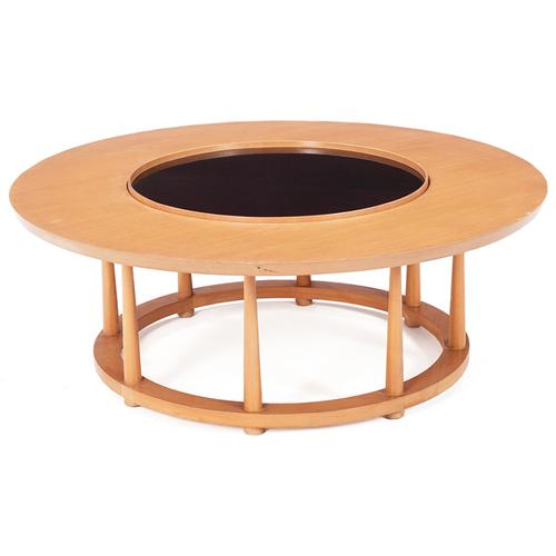 T.H. Robsjohn-Gibbings Lazy Susan coffee table, by Widdicomb, birch with black laminate rotating center and reverse-tapered supports, original finish, stenciled "84 RT", 39.5"dia. x 14.5"h, very good condition