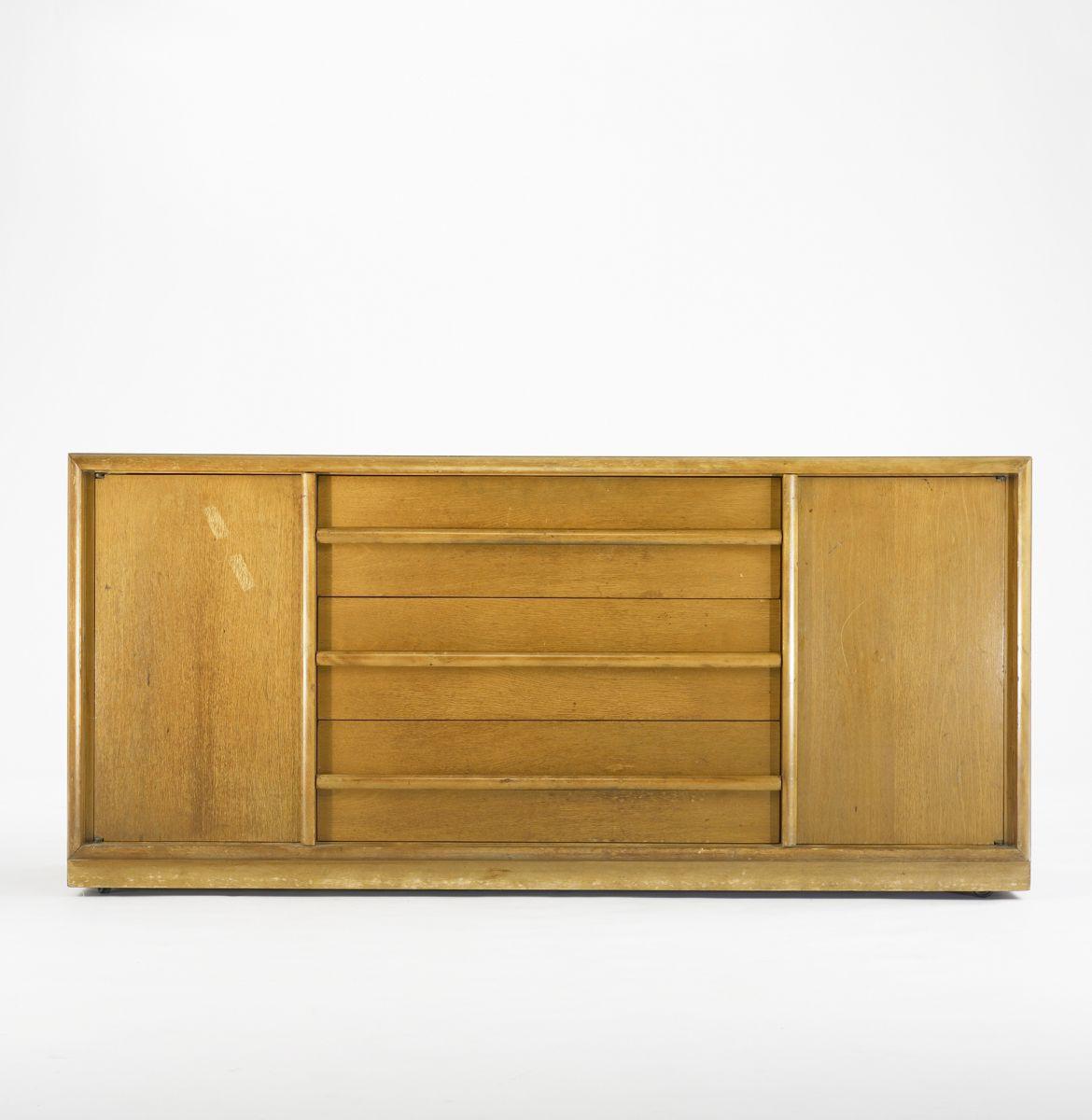 This buffet features three drawers and two doors concealing two adjustable shelves. Signed with applied manufacturer's label to drawer: [Widdicomb designed by T.H. Robsjohn-Gibbings].