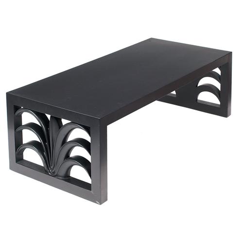 T.H. Robsjohn-Gibbings coffee table, by Widdicomb, rectangular form in ebonized wood with decorative carving to ends, refinished, 48"w x 22"d x 15.75"h, very good condition