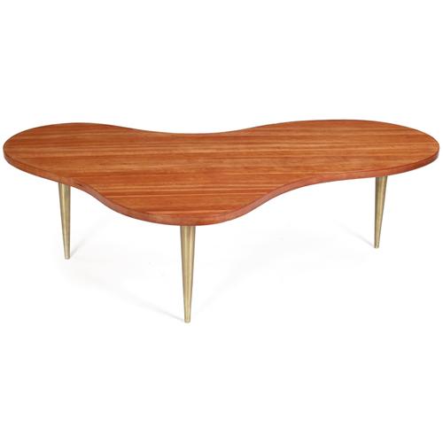 T.H.Robsjohn-Gibbings coffee table, by Widdicomb,1952, biomorphic top in cherry over three tapered brass legs, marked with Widdicomb label and stenciled date, re finished,71in.w x 44in.d x 19.5in.h, very good condition