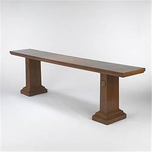 T.H. Robsjohn-Gibbings<BR>console table<BR>Saridis of Athens<BR>Greece, 1961<BR>walnut, brass<BR>114"w x 19"d x 32"h<BR>The following eight lots were commissioned directly from T.H. Robsjohn-Gibbings, for a custom interior in Toronto by Philip Johnson. GibbingsÍ passion for Greek furniture began in 1933 with a discovery of a klismos design on a candelabrum in the British Museum. The find was an epiphany for the designer, spurning the development of hundreds of Greek furniture forms by the designer. The designs he found in ancient Greek art were a logical departure from the "indigestible mixture of Queen Anne, Georgian and Spanish styles" prevalent at that time. Gibbings remarked that, "on Greek vases I saw furniture that was young, untouched by time." His custom commissions for the elite produced extraordinary interiors for clients such as Elizabeth Arden, Walter Annenberg and Aristotle Onassis. The superbly executed designs of these lots illustrate GibbingsÍ finest custom work, showcasing his "opulence of understatement." Gibbings, who was chosen by Philip Johnson to collaborate on the residence and office, furnished the private Toronto commission.<BR><BR><BR>A large and finely detailed masterwork by Robsjohn-Gibbings. Metal label to underside: [Designed By - T.H. Robsjohn Gibbings Manufactured by Saridis of Athens] with original vendor's paper label in Greek.<BR>Provenance: Private collection, Toronto<BR>