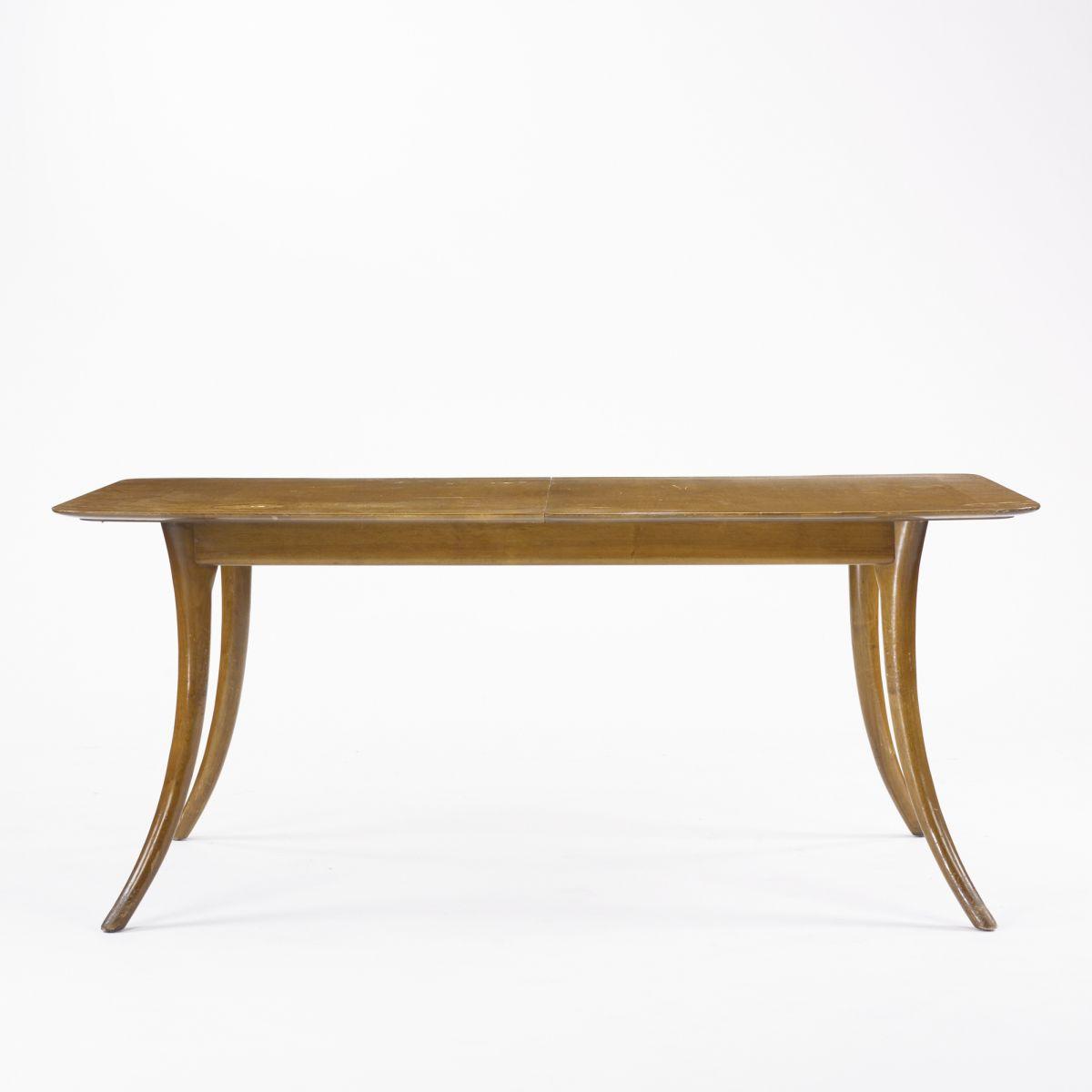 Sold with two 18-inch leaves; table measures 104 inches when fully extended. Signed with manufacturer's label to underside: [Widdicomb Designed by T.H. Robsjohn-Gibbings] and stamped: [4/55 4301 Sherry].