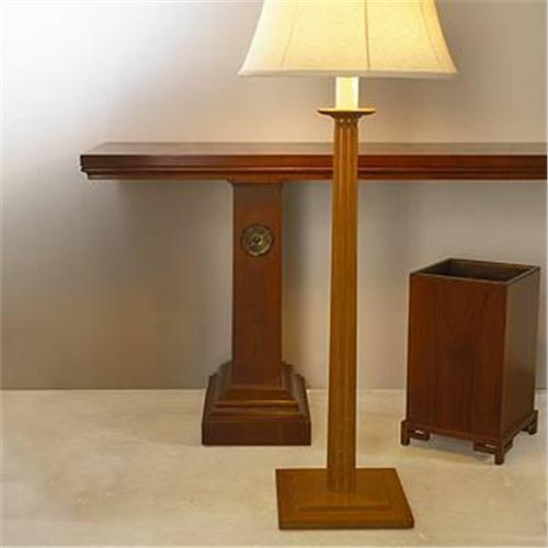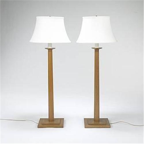 T.H. Robsjohn-Gibbings<BR>floor lamps, pair<BR>Saridis of Athens<BR>Greece, 1961<BR>walnut, lacquered wood, enameled metal, linen<BR>19"dia x 51.5"h<BR>Robsjohn-Gibbings used a Doric column motif as the stem for this pair of floor lamps. Saridis craftsmen executed the design precisely, with a slight taper to the design from bottom to top.<BR>Provenance: Private collection, Toronto<BR><BR><BR><BR>