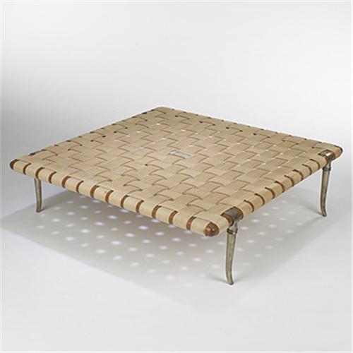 T.H. Robsjohn-Gibbings ottoman Widdicomb USA, c. 1950 walnut, canvas, brass, upholstery 40"w x 40"d x 16"h Signed with silk manufacturer's label to seat.