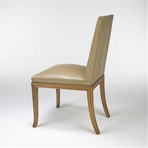 T.H. Robsjohn-Gibbings<BR>side chair<BR>Saridis of Athens<BR>Greece, 1961<BR>walnut, leather<BR>21"w x 22"d x 37.5"h<BR>Metal label to underside: [Designed By - T.H. Robsjohn Gibbings Manufactured by Saridis of Athens] with original vendor's paper label in Greek.<BR>Provenance: Private collection, Toronto<BR><BR><BR><BR>