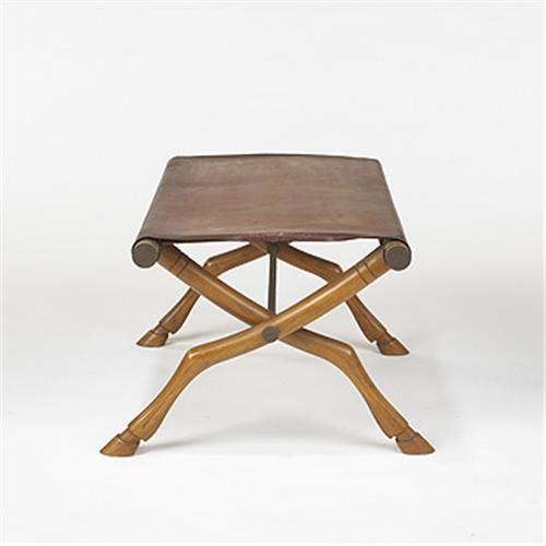 T.H. Robsjohn-Gibbings stool Sardis Greece, c. 1960 walnut, leather, brass 32"w x 19"d x 17"h This stool echoes the forms and styles of Classical Greek designs. Literature: Furniture of Classical Greece, Robsjohn-Gibbings and Pullin, pg. 71