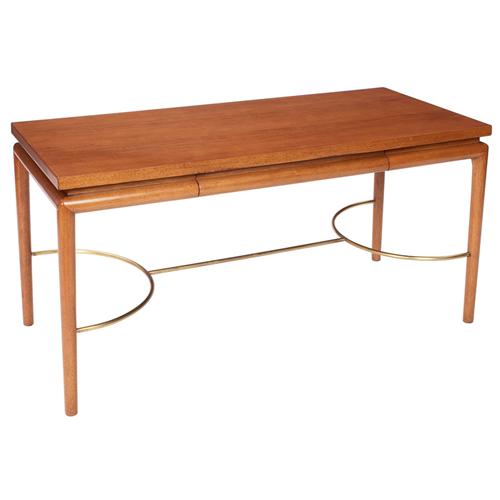T.H. Robsjohn-Gibbings writing desk, by Widdicomb, rectangular top over rounded apron and tapered legs with brass-plated stretchers, one drawer, unmarked, 54"w x 24"d x 26"h, refinished, very good condition